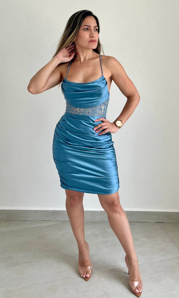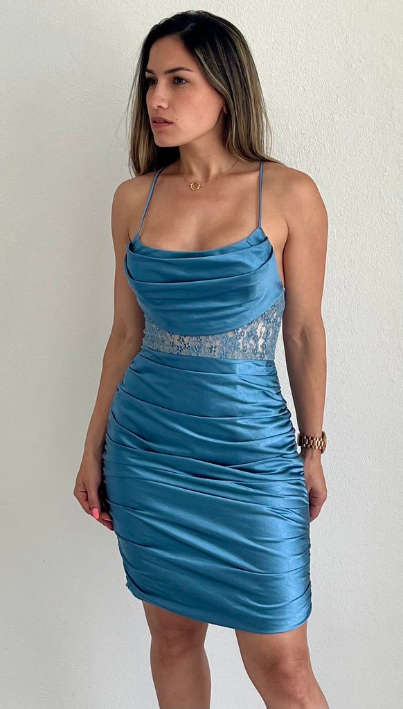 featuring Spaghetti Straps Top, Fitted and Draped Ligh Blue Satin Fabric at the Top & Skirt with Blue Flowers Lace Detail at the Waist with Nude Lining.