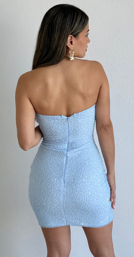 featuring Strapless Top, Fitted at the Waist & Hips in a Light Blue Fabric and Beads Details .