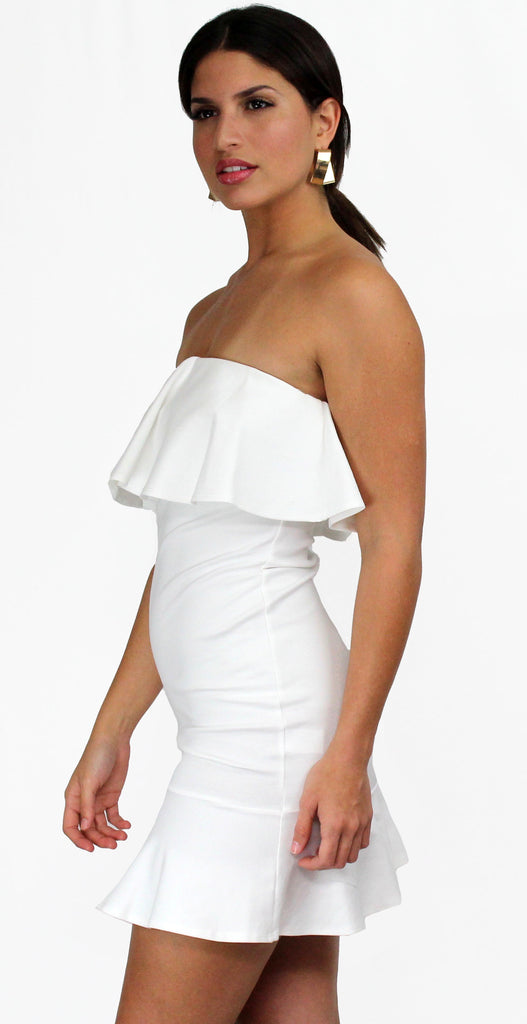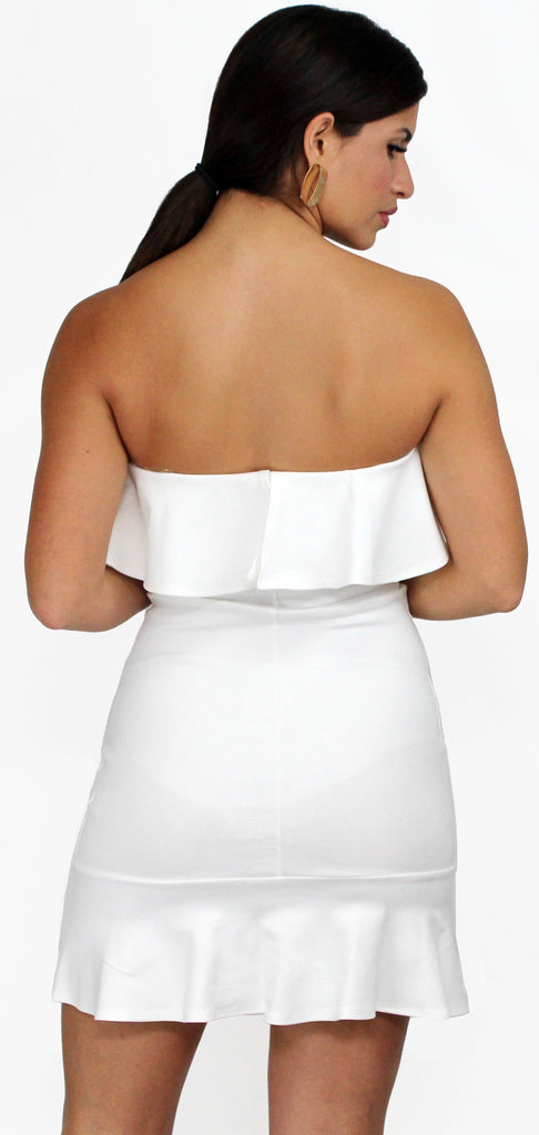 featuring Strapless Bodycon Dress with Ruffle Layer at the Top & Bottom in a Smooth White Fabric.