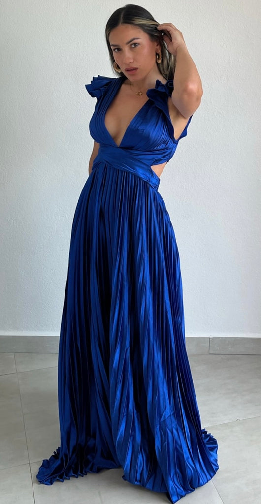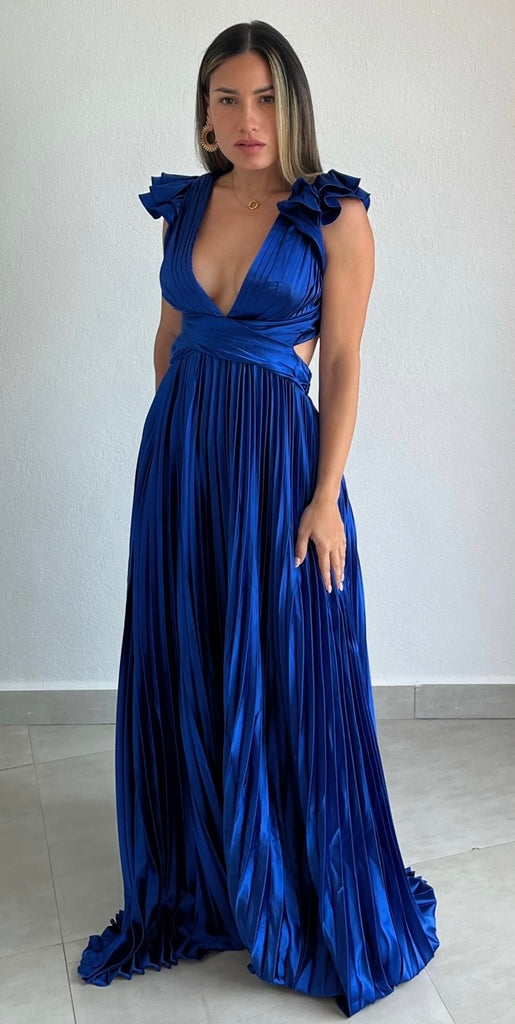 Lovely Royal Blue Plated & Ruffled Maxi Dress