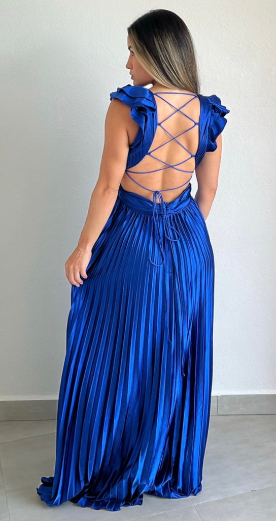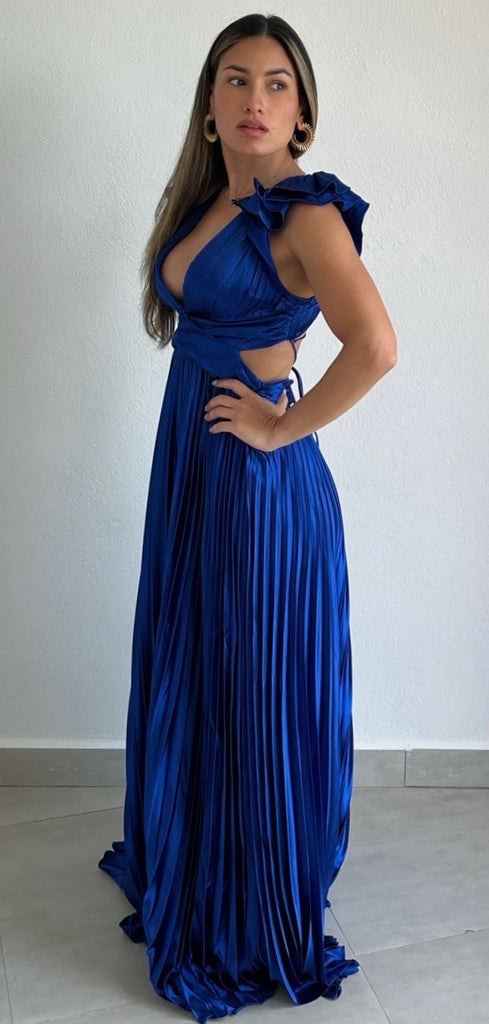 featuring V-Neck Top with Ruffle Skort Sleeves and Crossed at Back with Flare Plated Skirt in a Satin Royal Blue Fabric.