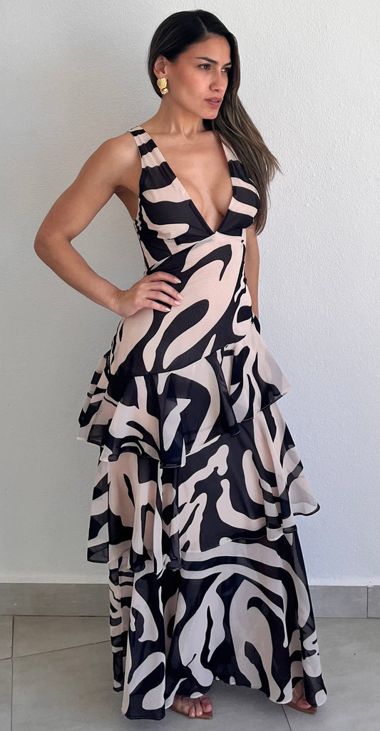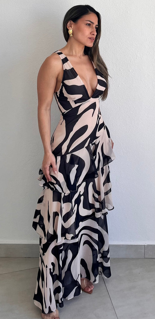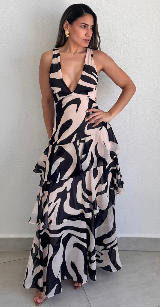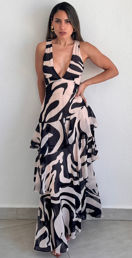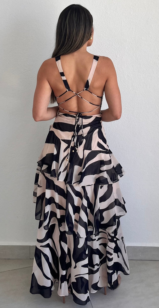 featuring Deep V-Neck Halter Top, Crossed Spaghetti Straps at the Back, Fitted at the Waist and Ruffled Maxi Skirt in a Print Chiffon Fabric.