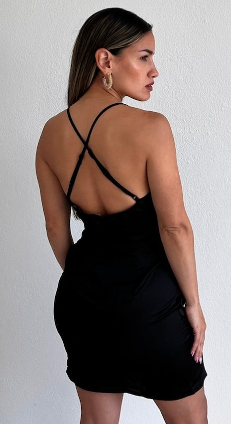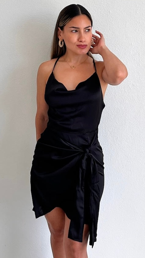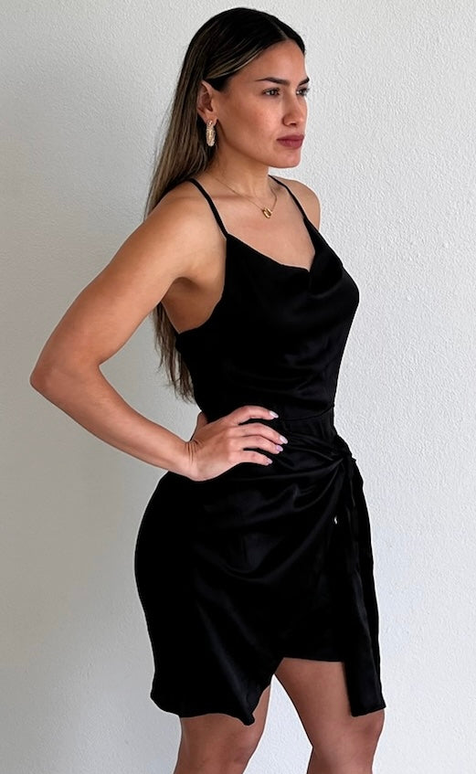 featuring Cowl Neck Top, Crossed at the Back, Fitted at the Waist and Mini Skirt with Adjustable Over-Layered Knot in a Satin Black Fabric.