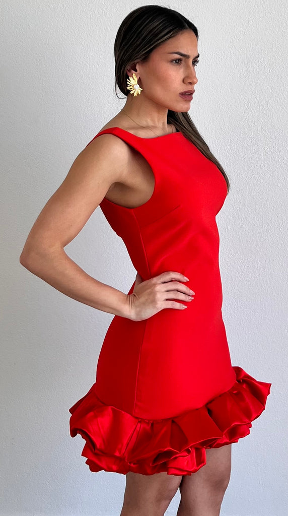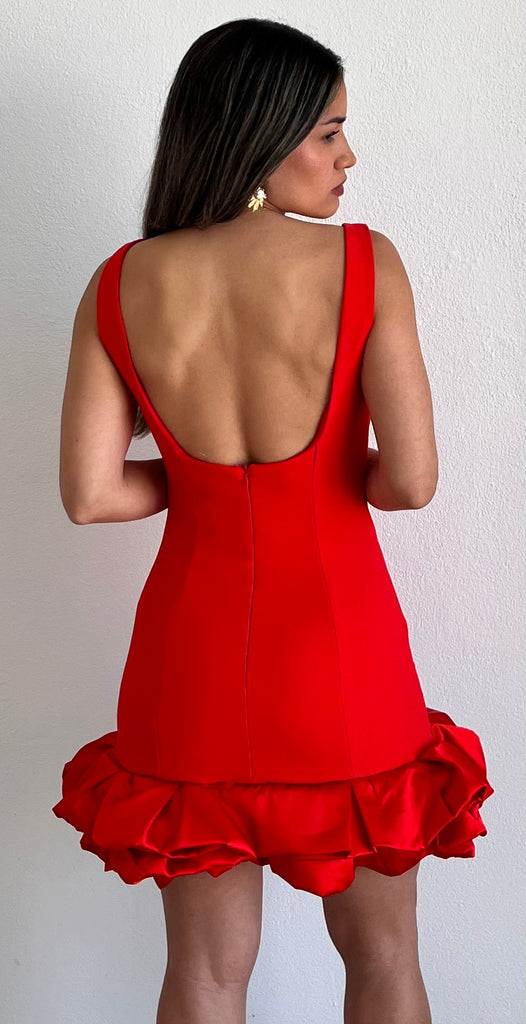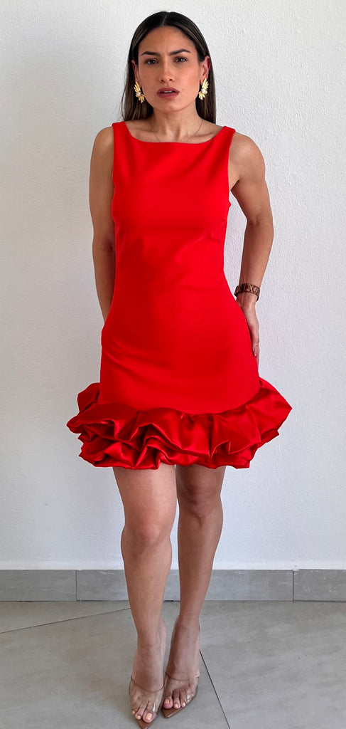 featuring Sleeveless Top with Open Back, Fitted at the Waist and Hips with Satin Ruffled Details at the Bottom of the Dress in White Fabric.