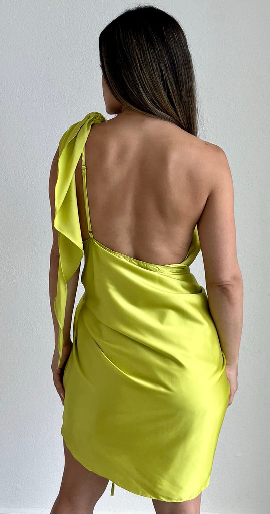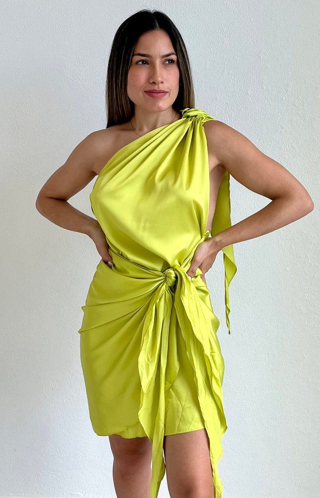 featuring One-Shoulder Dress with Adjustable Knot at the Hips in a Soft Satin Lime Fabric.