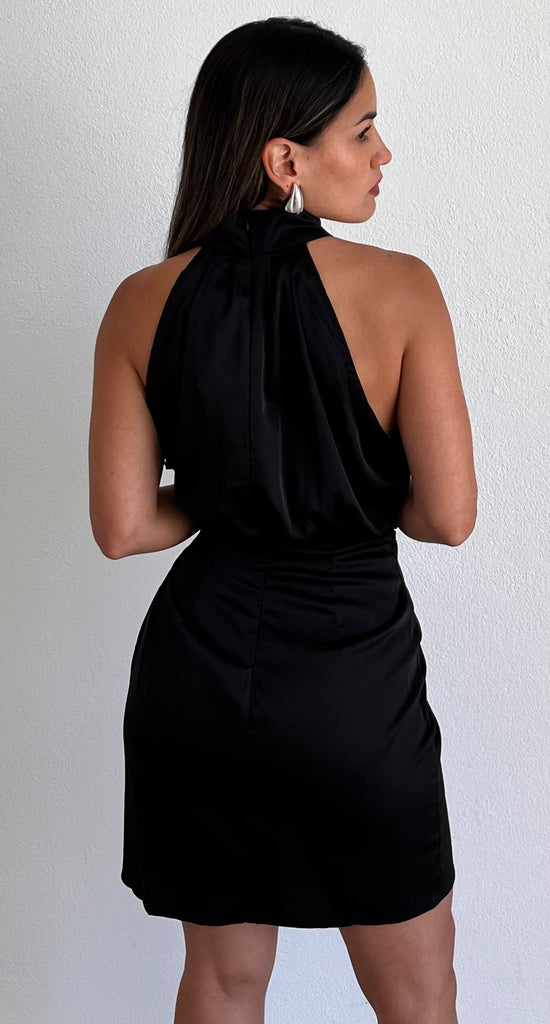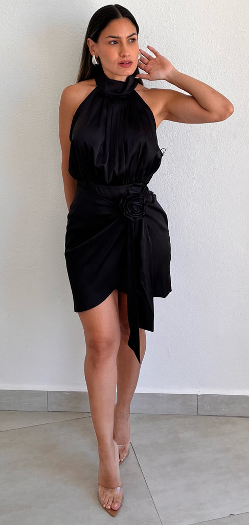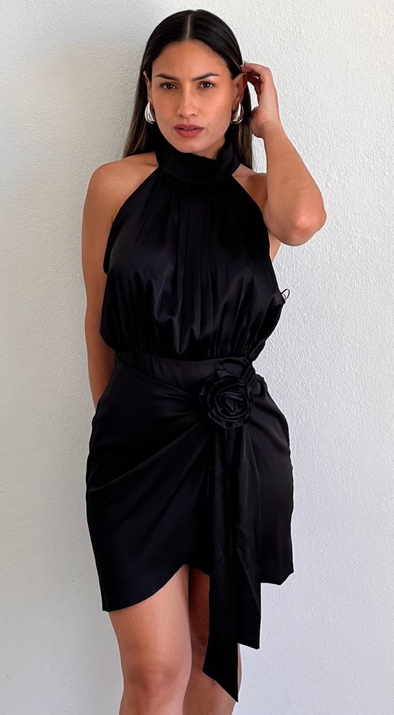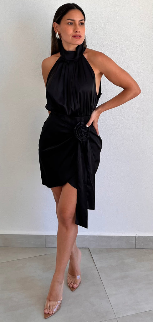 featuring Halter Top, Fitted at the Waist and Mini Skirt with Adjustable Over-Layered Knot & Flower Pin in a Satin Black Fabric.