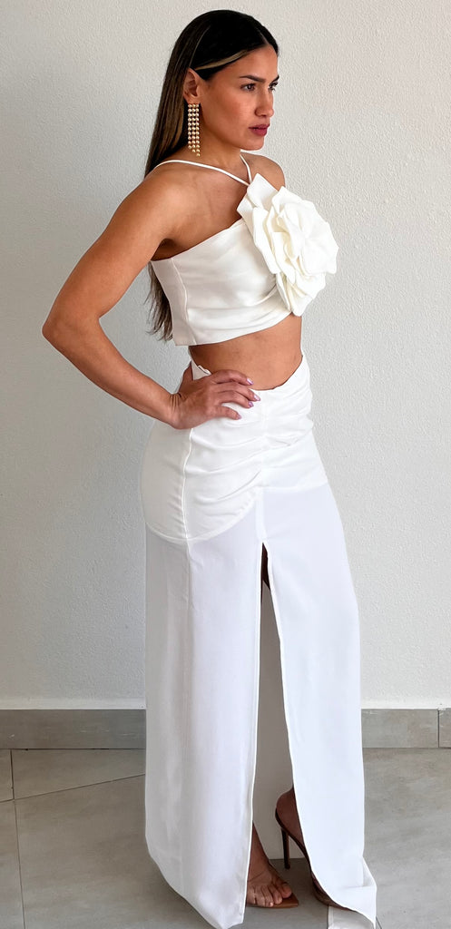 featuring Flower Halter Top with Straps, Cut-Out at the Waist and Open Slit Maxi Skirt in a White Fabric.