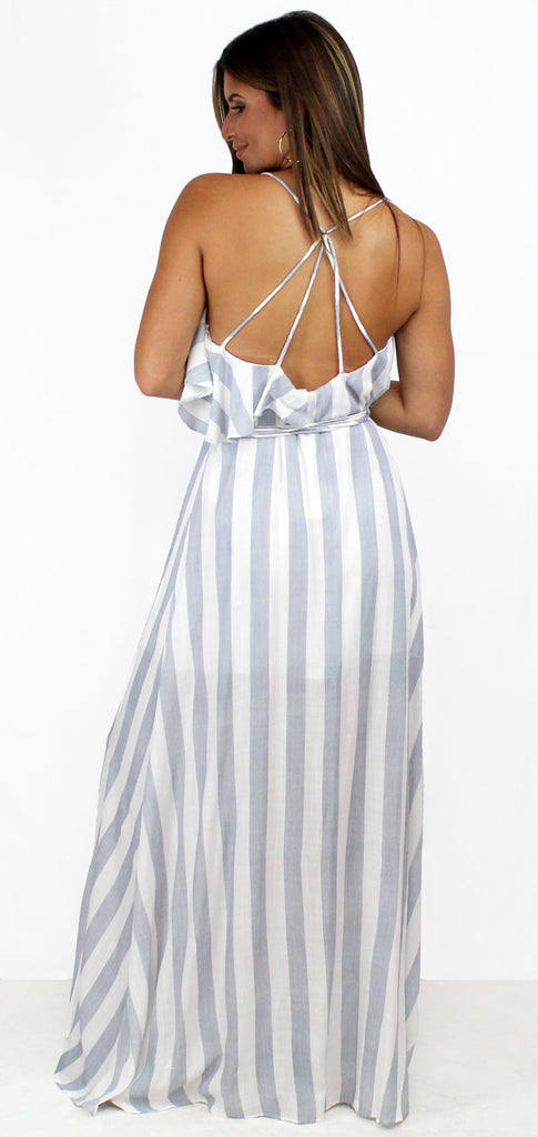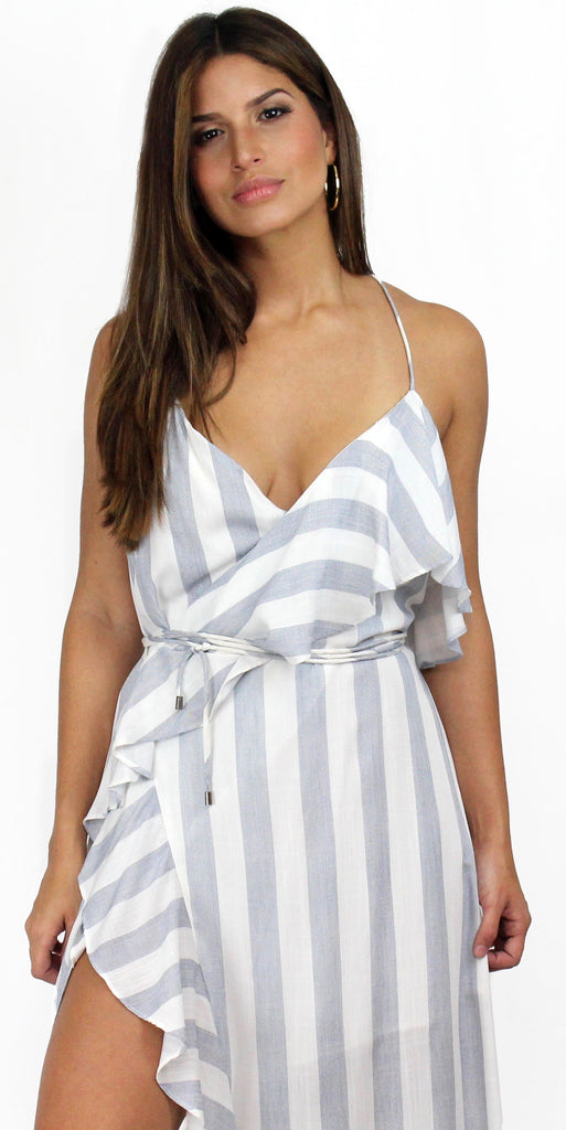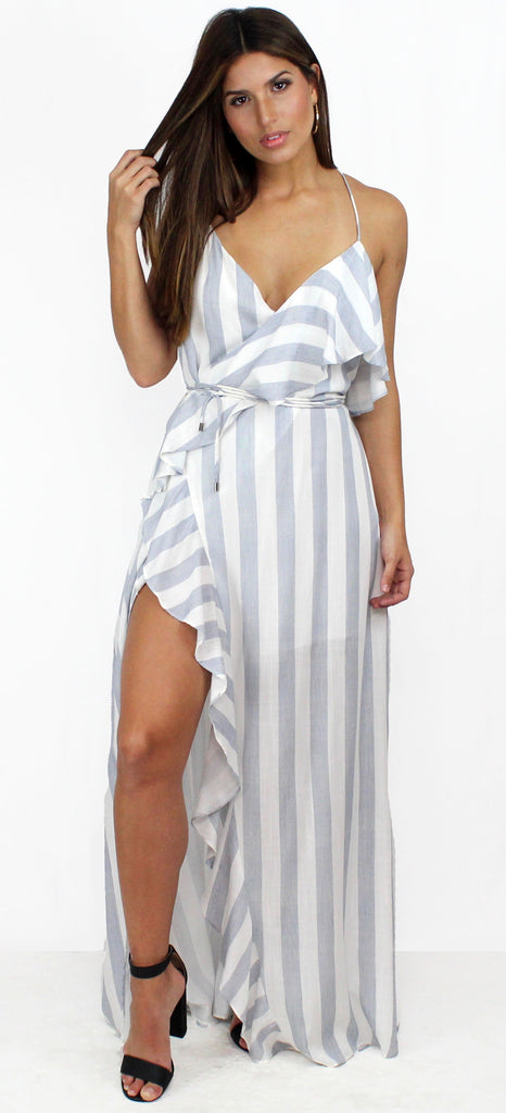 featuring V-Neck Wrap a Round Maxi Dress with Open Slit and Ruffle Detail in one side. Maxi Dress in a Comfy Cotton White & Blue Stripes Fabric,