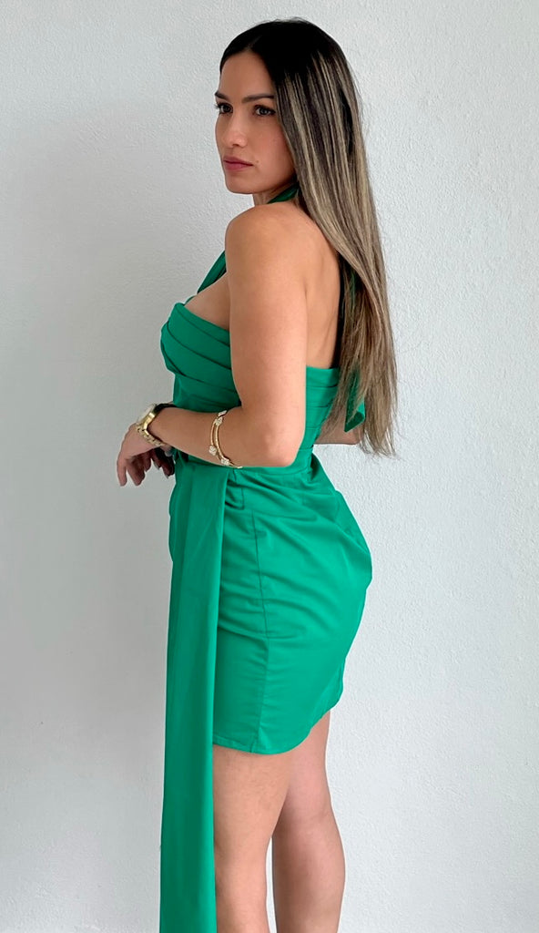 featuring Halter Top with Knot Detail, Draped Detail at the Top and Asymmetrical Skirt with Over Layered Long Fabric in a Cotton Green Fabric.