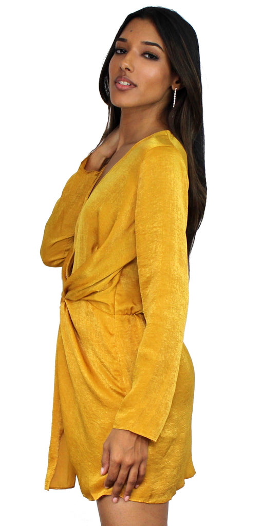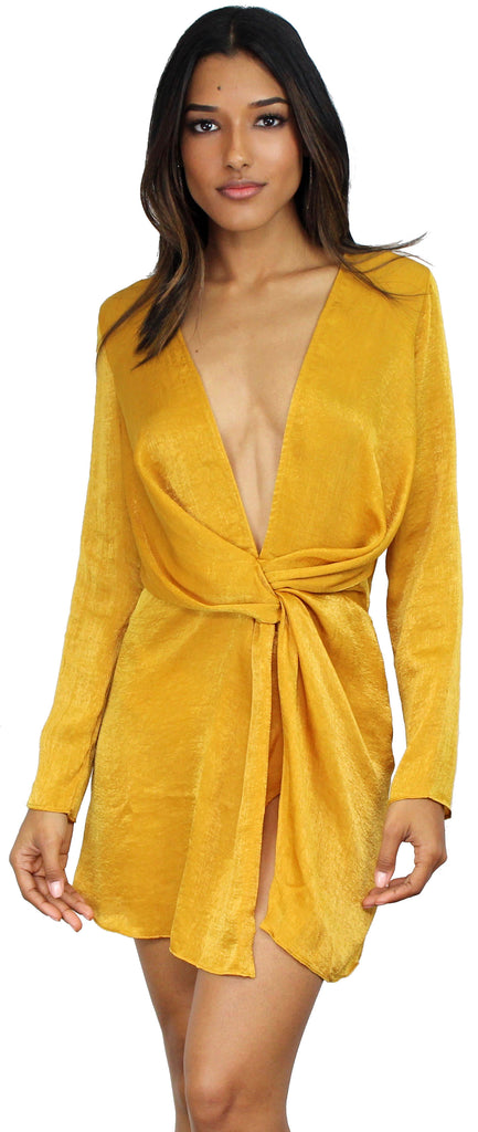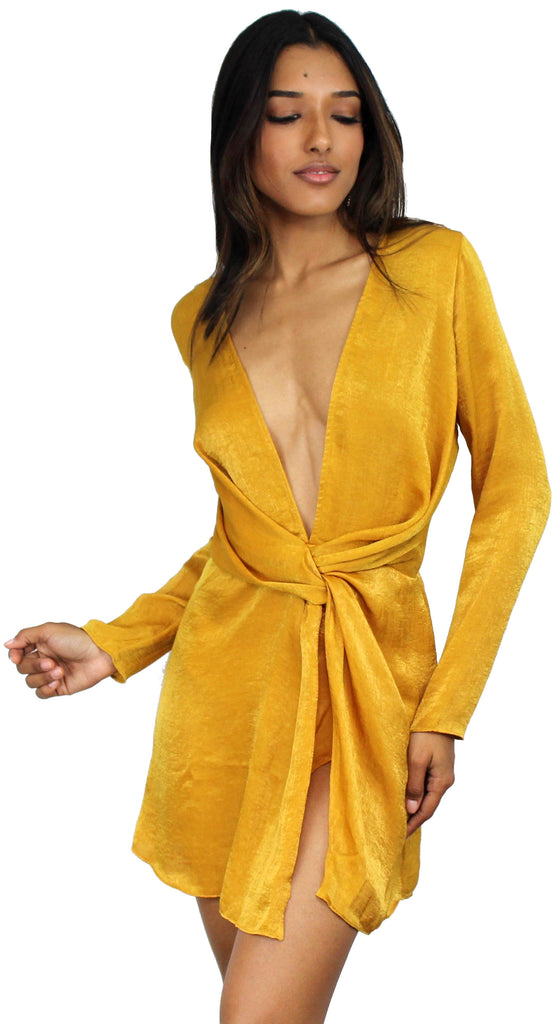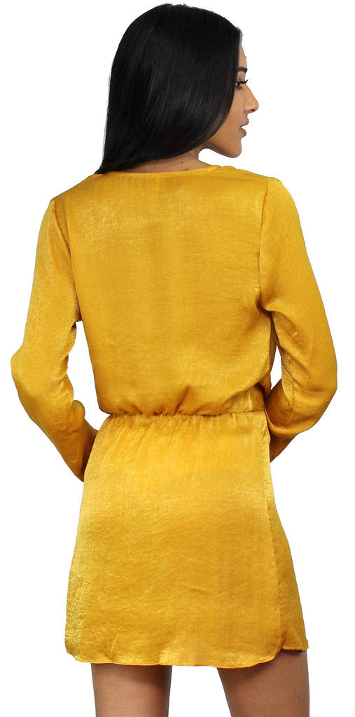 Showstopper Mustard Satin V-Neck Dress