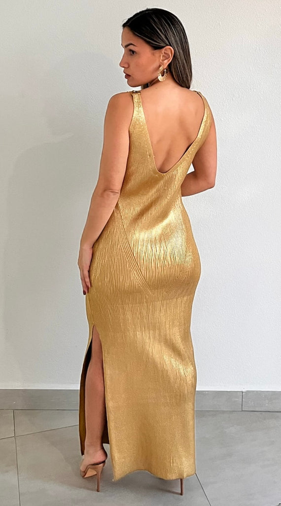 featuring V-Neck Top with Metal Detail Straps, Fitted Bodycon Midi Dress, Open Slit at the Side in a Metallic Knit Gold Fabric.