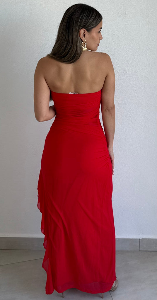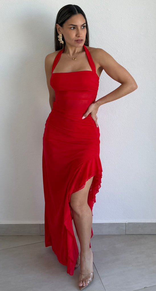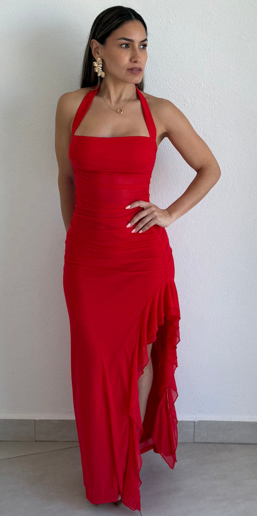 featuring Halter Top, See Through Draped at the Waist & Hips with Open Ruffled Slit in a Red Spandex Mesh Fabric.