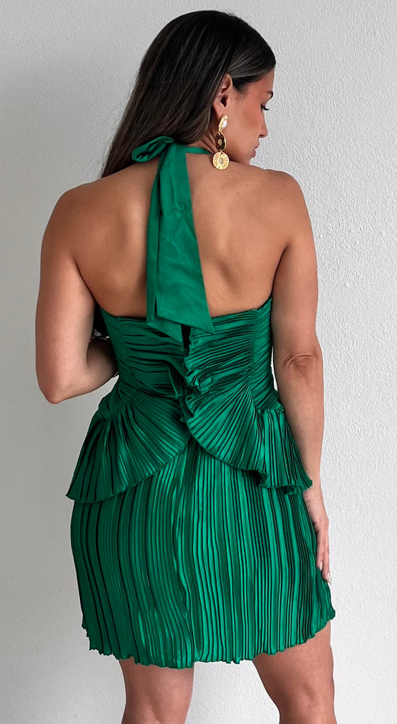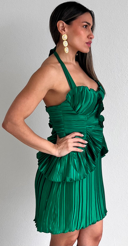 featuring Halter Top with Breast Cups with Ruffled Detail, Fitted at the Waist and Short Skirt in a Pleated Satin Fabric.