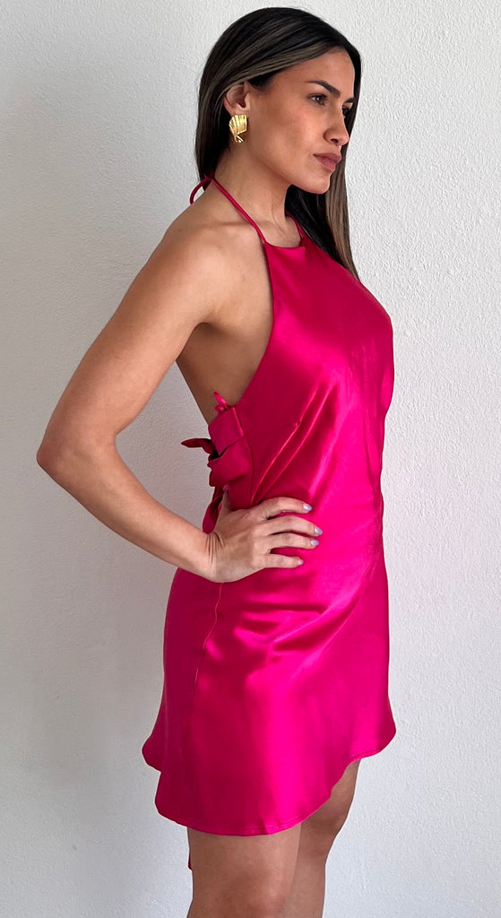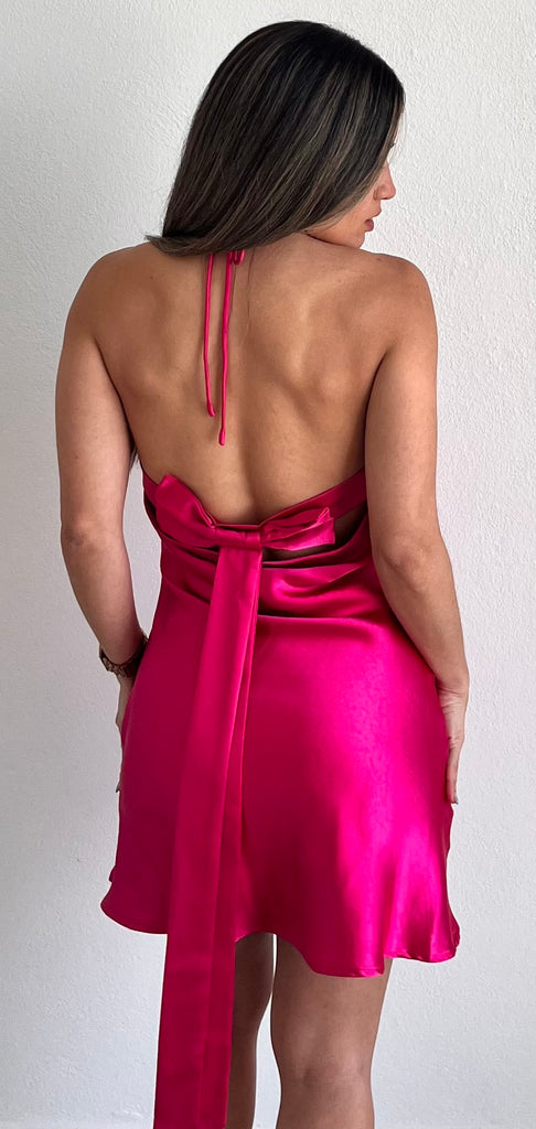 featuring Halter Top with Open Back and Bow Detail with Short Skirt in a Soft Fuchsia Satin Fabric.