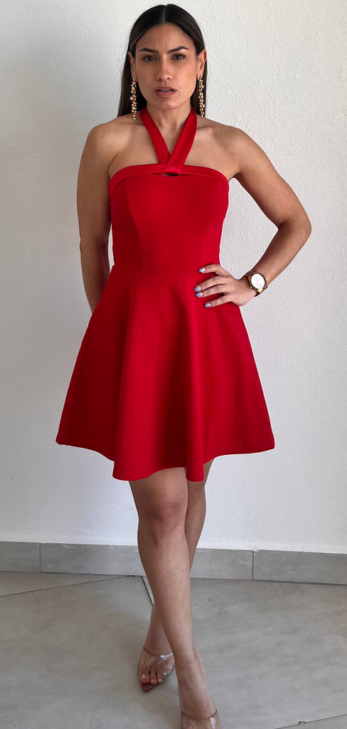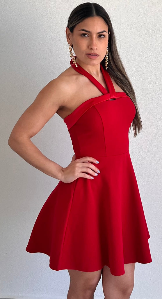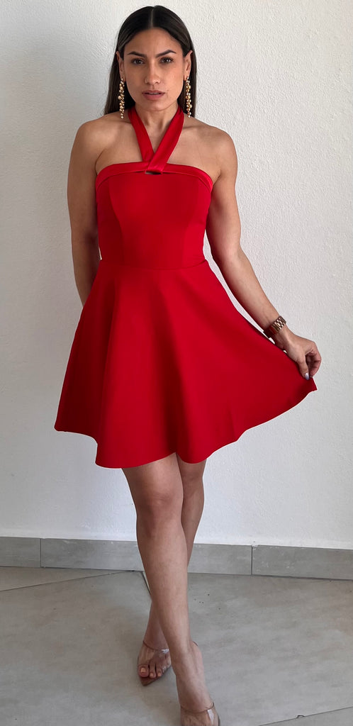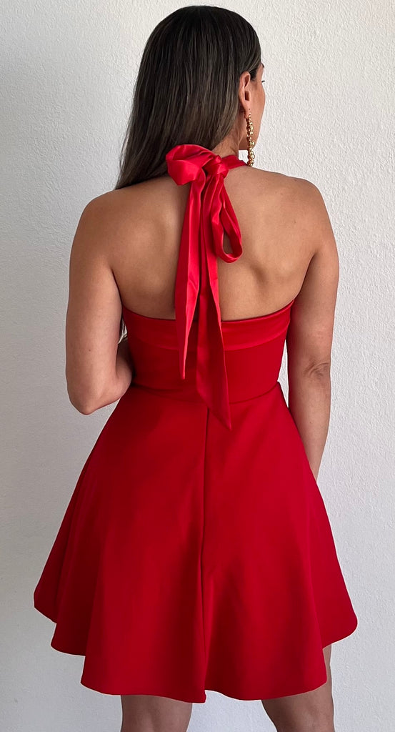featuring Strapless Top with Chiffon Fabric Detail at the Back to Adjustable Bow, Fitted at the Waist and Flare Skirt in a Red Fabric.