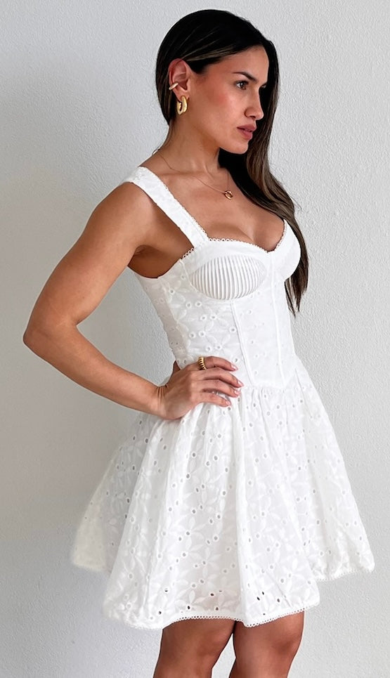 featuring Bold Straps with Heart Cut Top, Corset at the Waist and Flare Skirt in a White Eyelet Delicate Fabric.