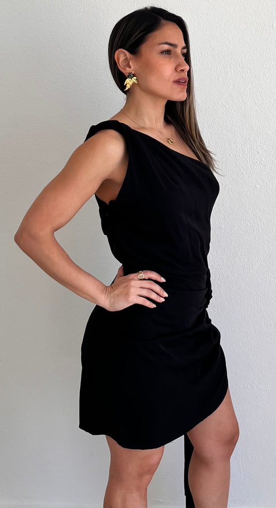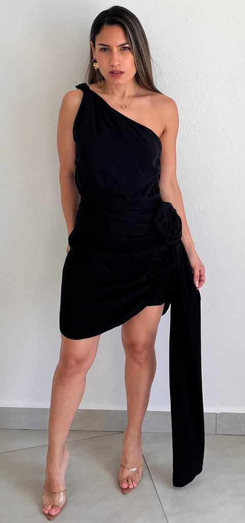featuring Twisted One-Shoulder Top, Fitted at the Waist with Fabric Flowers Detail at the Hips in Black Fabric.