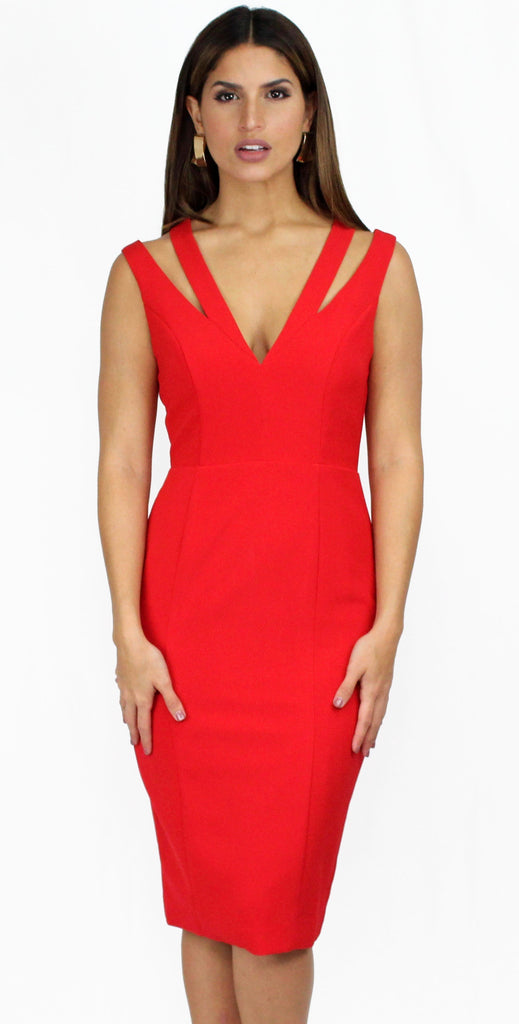featuring V-Neck Top with Double Bold Straps and Cut-off at the Back, Fitted Midi Skirt in a Red Fabric.