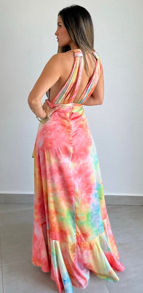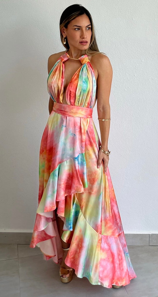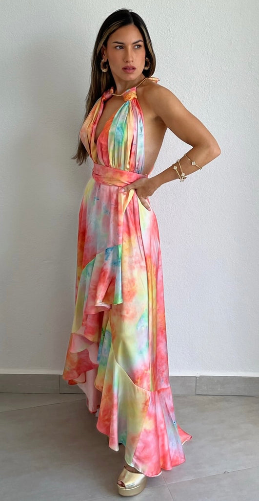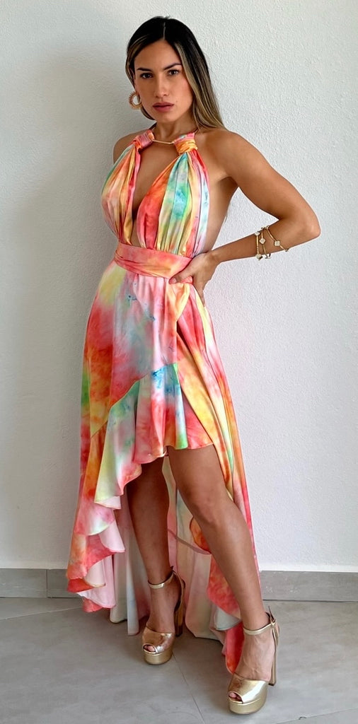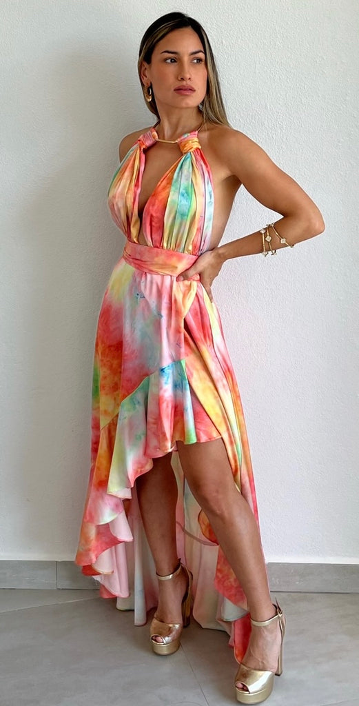featuring Halter Top with Gold Necklace Included, Fitted at the Waist and High-Low Flare Skirt with Ruffled at the End in a Soft Coral Print Satin Fabric.