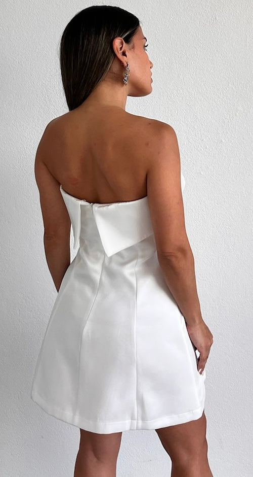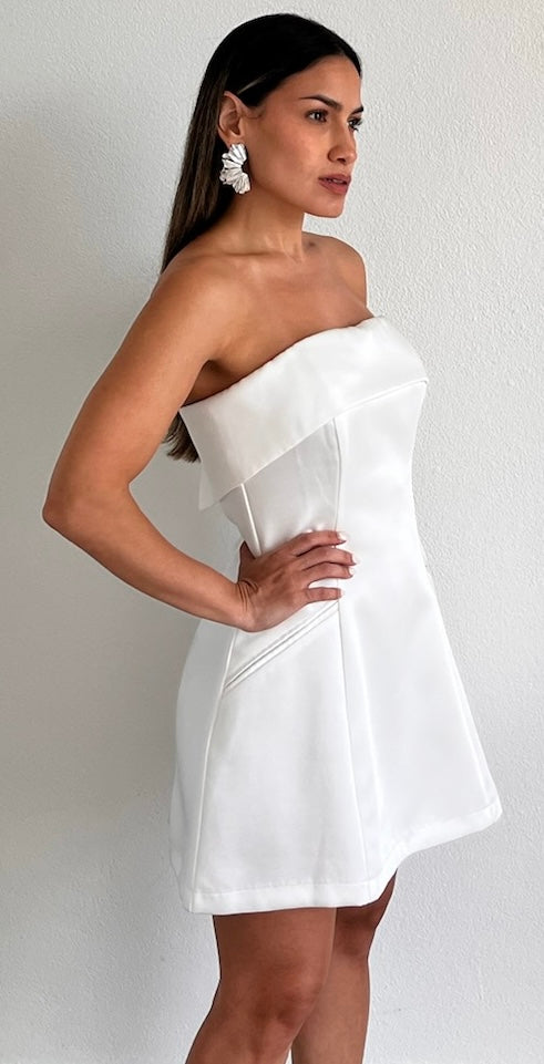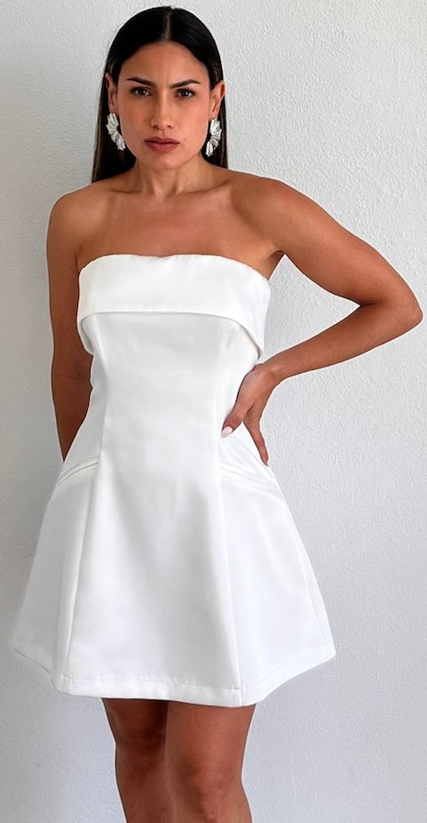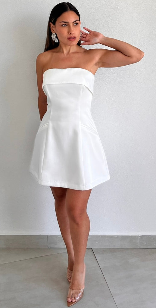 featuring Strapless Top Fitted at the Top & Waist and Flare Skirt in a White Delicate Satin Fabric.
