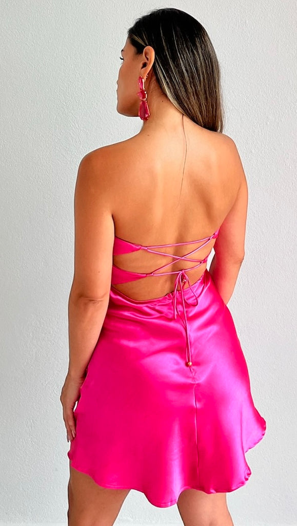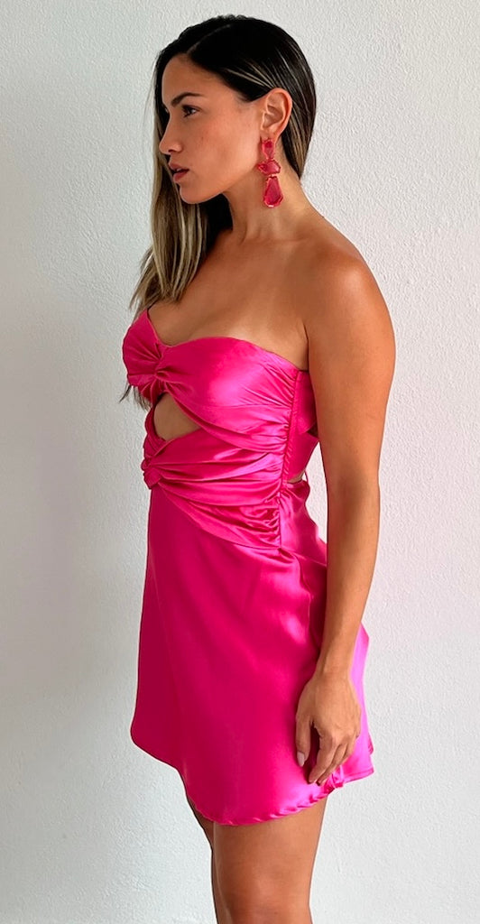 featuring Strapless Draped Top with Cut-Out Detail at the Center & Crossed at the Back. Loose Short Skirt in a Soft Satin Hot Pink Fabric.