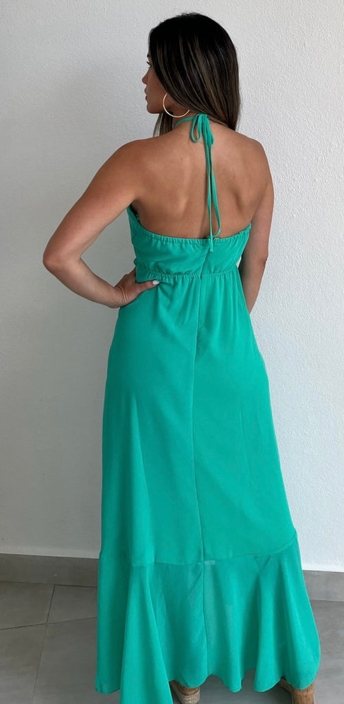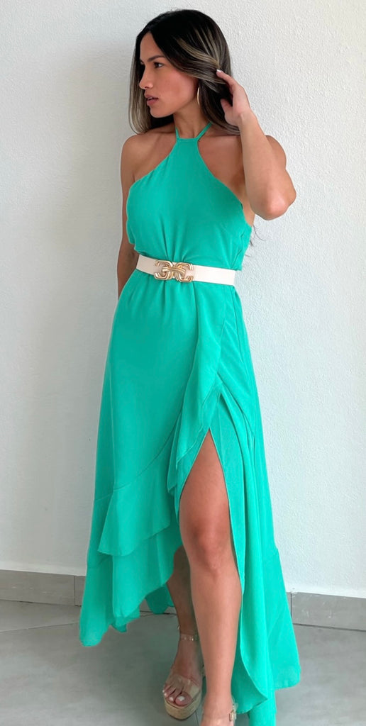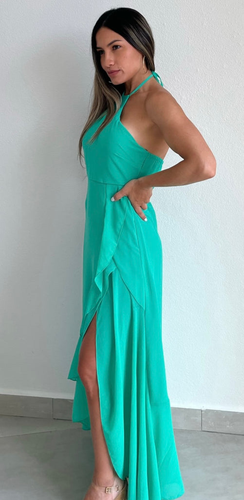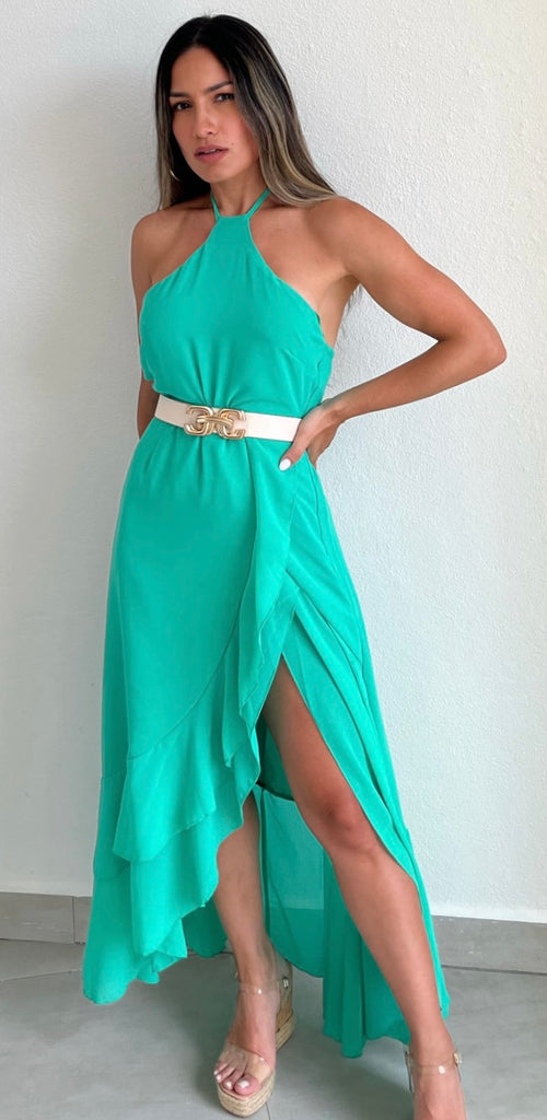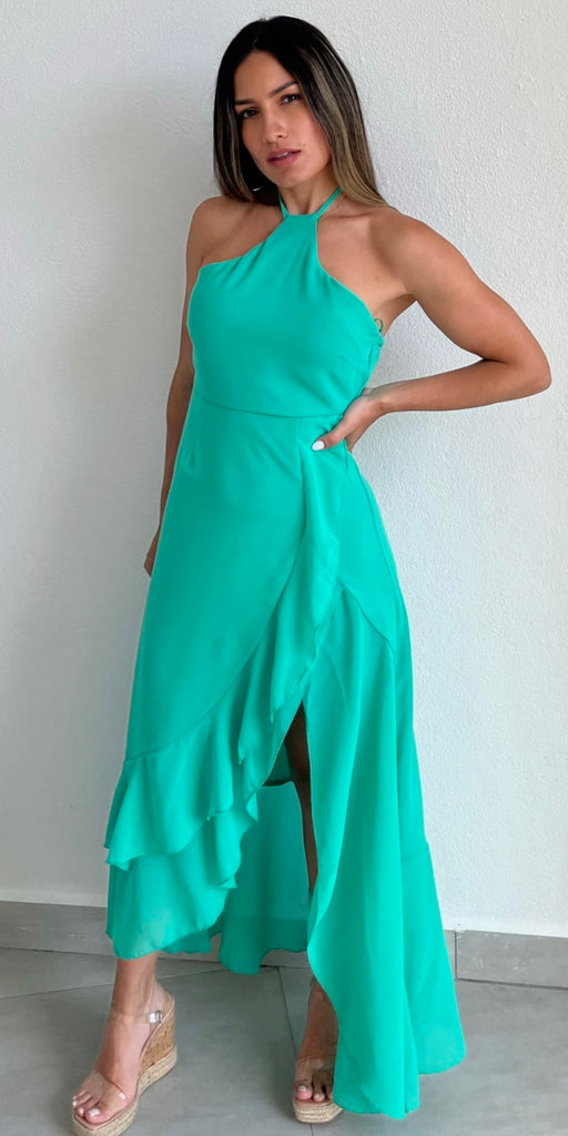 featuring Halter Top, Fitted at the Waist and Flare High-Low Skirt with Ruffled Detail at the Bottom in a Chiffon Green Fabric.