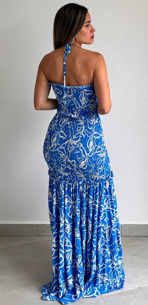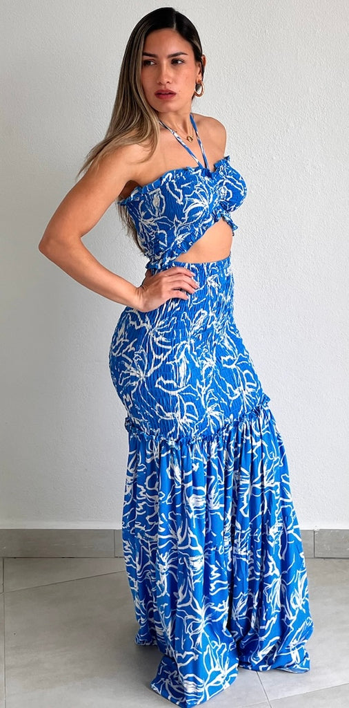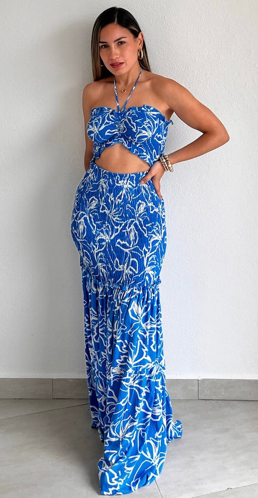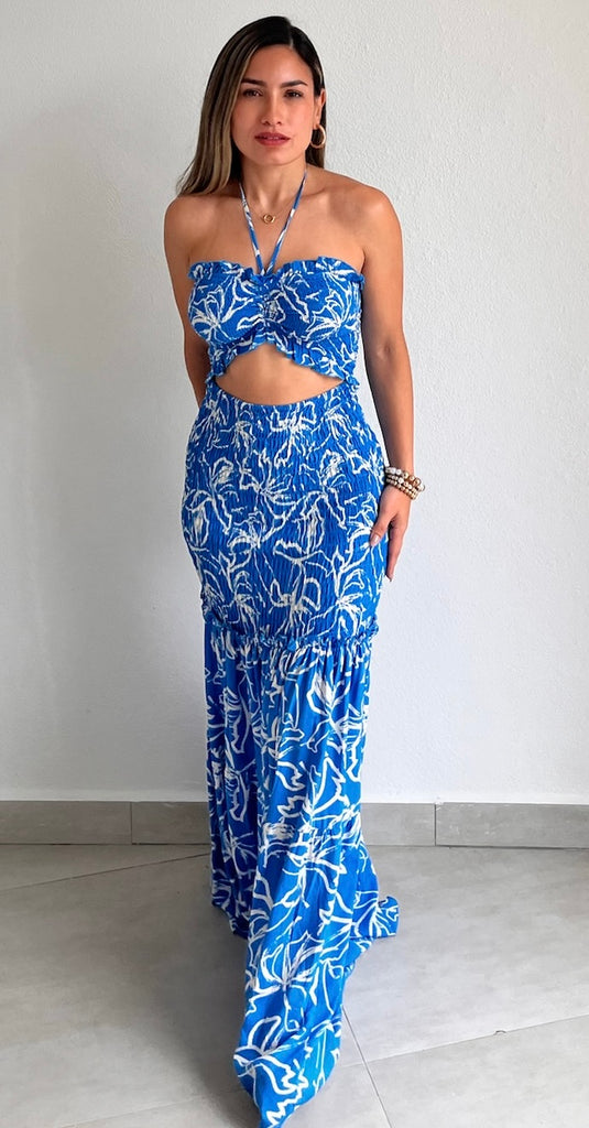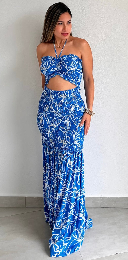 featuring Halter Top with Cut-Out Detail at the Waist, Fitted at the Hips and Flare Maxi Dress in a Light Weight Cotton Print Scrunch Fabric.