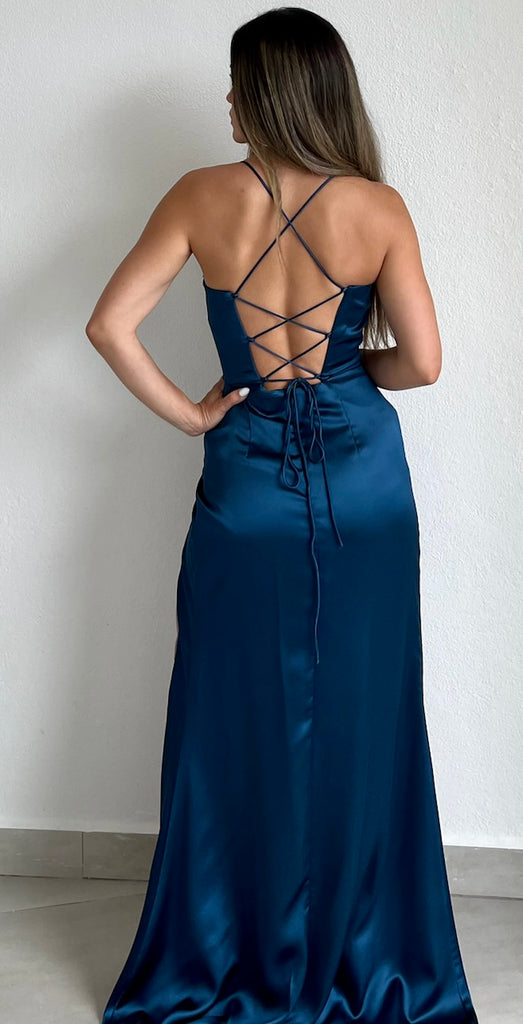 featuring Heart Cut at the Bust Corset Top, Crossed at the Back and Open Slit Skirt in a Soft French Navy Satin Fabric.