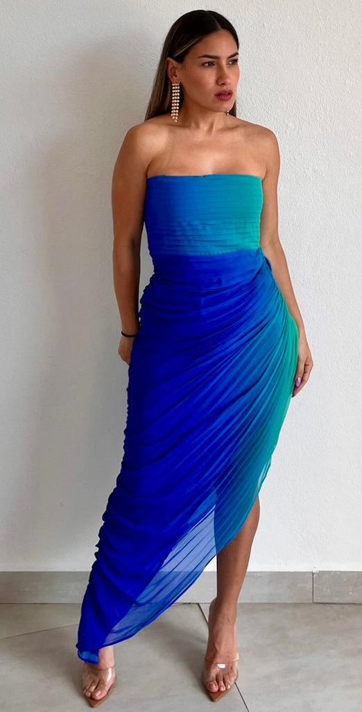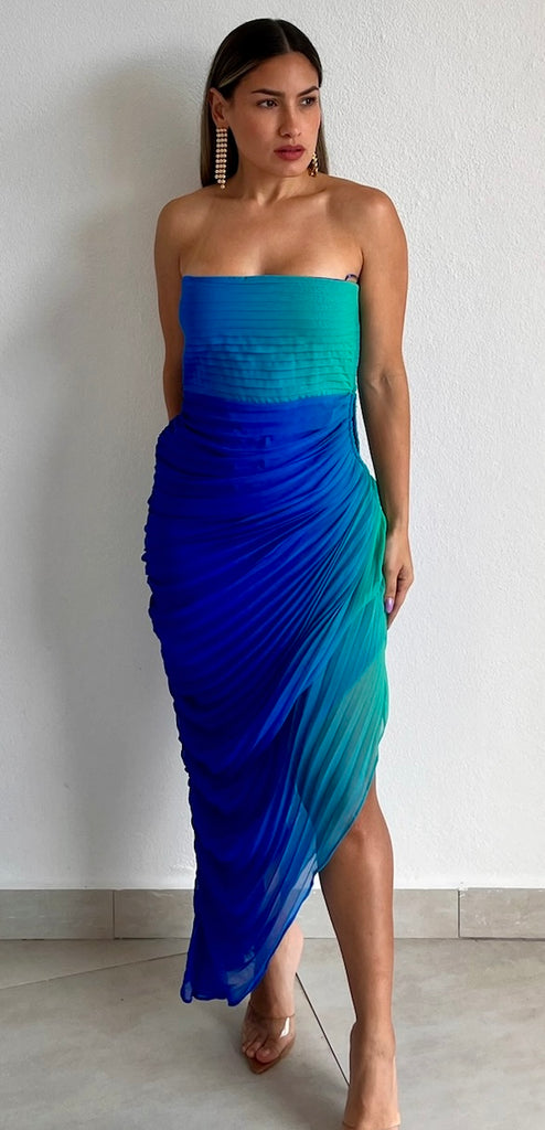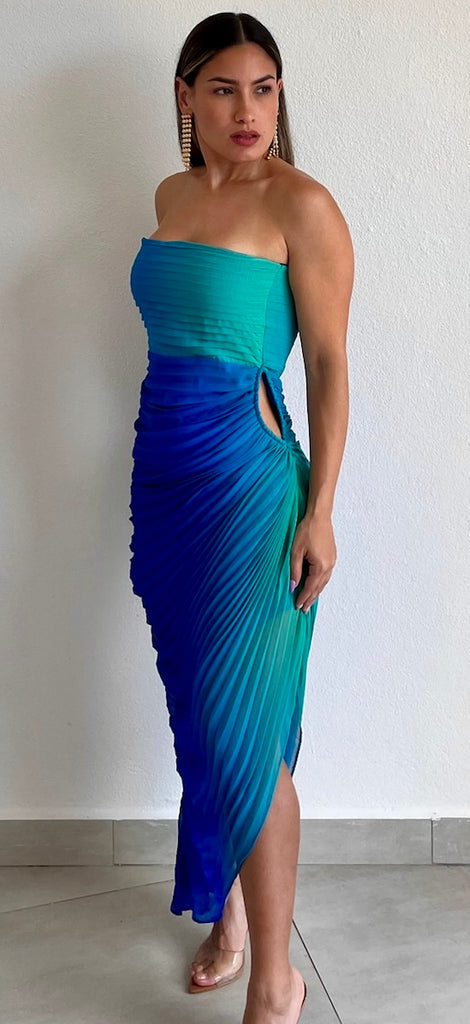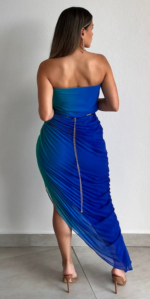 featuring Strapless Top with Circle Cut-Out Detail at Left Side of the Waist and Asymmetrical Midi Skirt in a Pleated Ombré Chiffon Fabric.