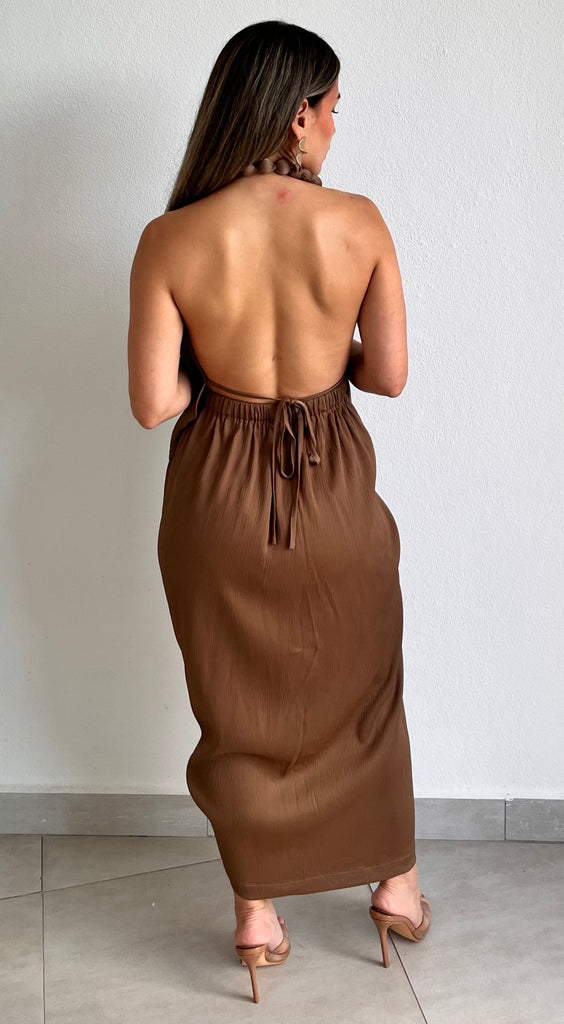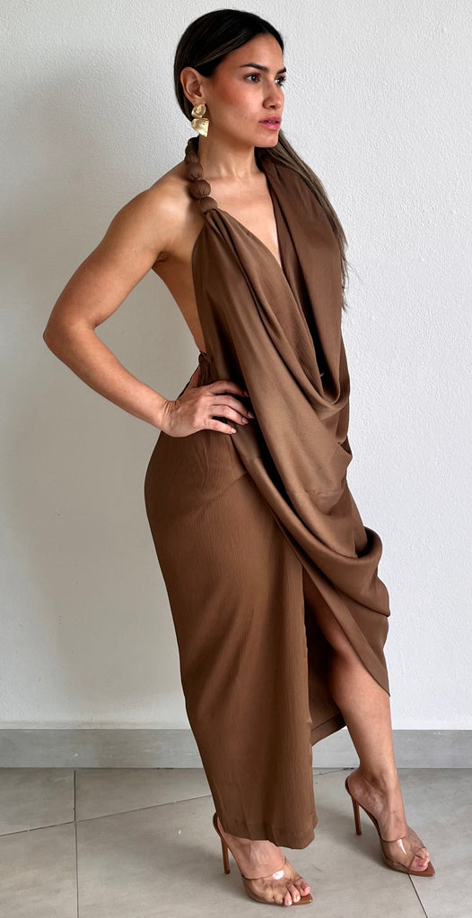 featuring Halter- Cowl Top with On-Side Balls Necklace Detail, Adjustable at the Waist and Asymmetrical Midi Skirt in a Mocha Fabric.