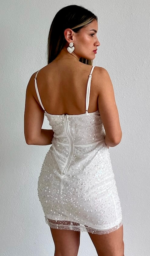 featuring Bustier V-Neck Top with See Through Mesh Detail at the Center, Fitted at the Waist and Mini Skirt in a Sequins & Pearls White Fabric.