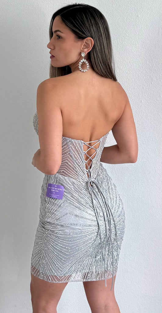 featuring Strapless Heart Cut Top with See Through Corset the Waist and Fitted Short Skirt in a Glitter Fabric.