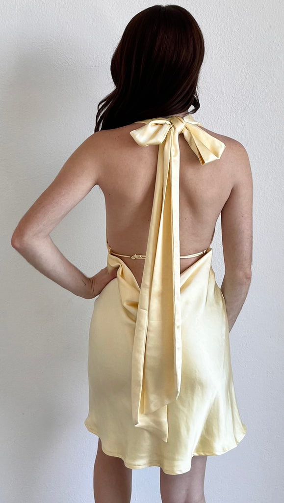 featuring Halter Top with Deep V-Neck & Cowl Back with Flare Short Skirt in a Soft Light Yellow Satin Fabric.