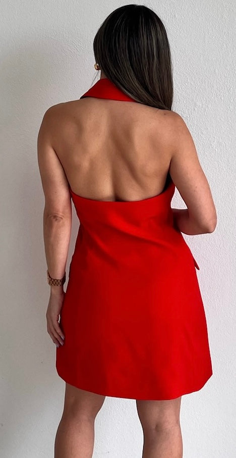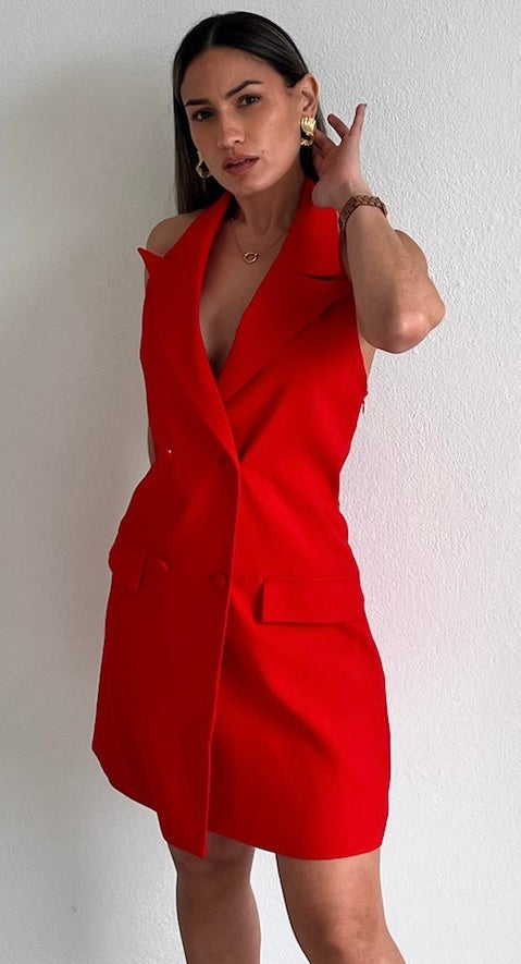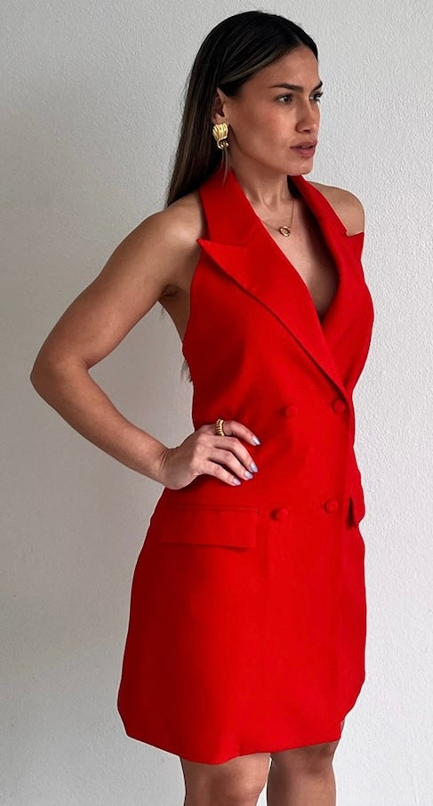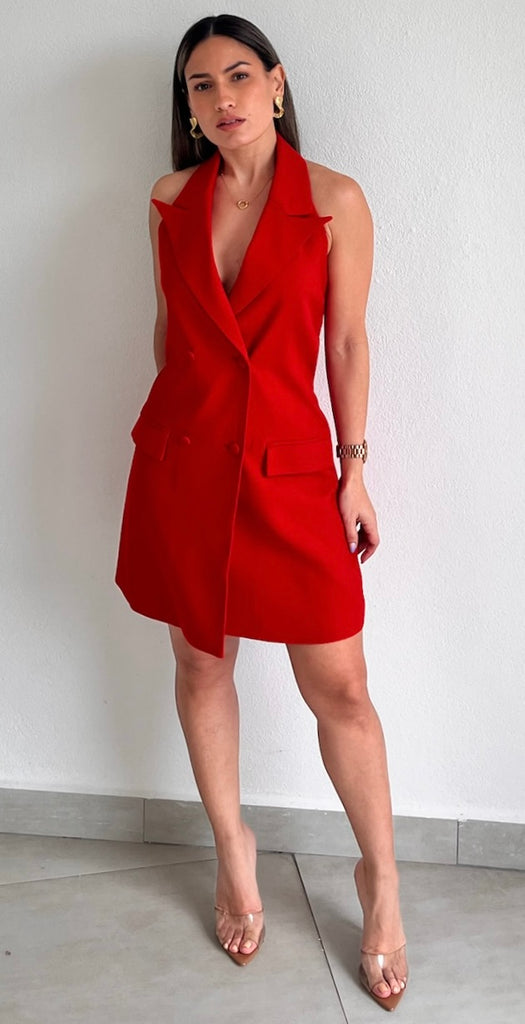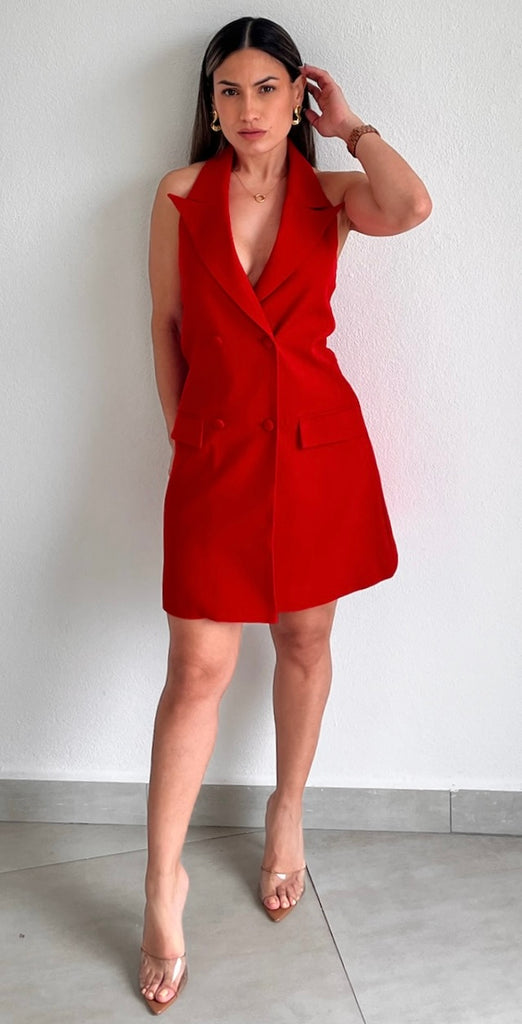 featuring V-Neck Blazer Collar Top, Buttons at the Front and Decorative Pockets in a Red Soft Fabric .