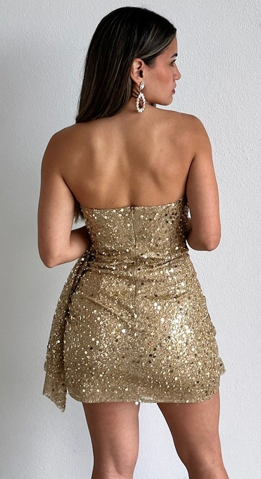 featuring Strapless Top, Fitted Corset at the Waist, Mini Skirt and Short Sash Detail at the Side in a Glitter, Sequins and Pearls Gold Fabric.