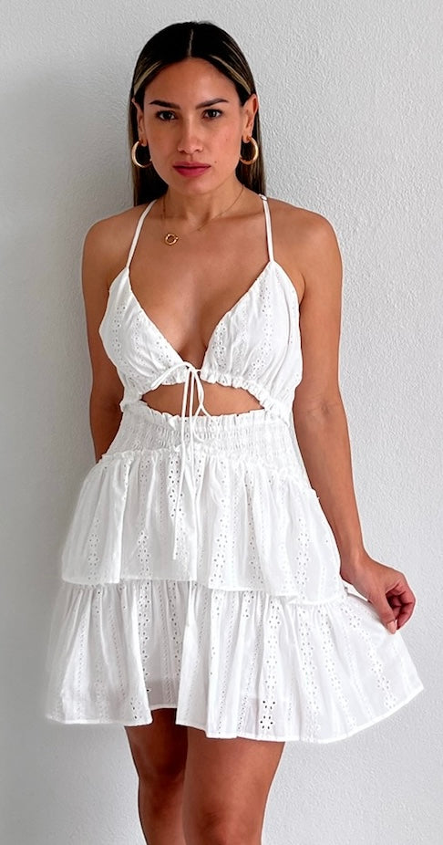 featuring V-Neck Top with Cut-Out at the Waist and Ruffled Skirt in a White Eyelet Delicate Fabric.