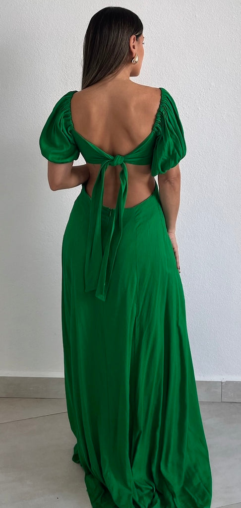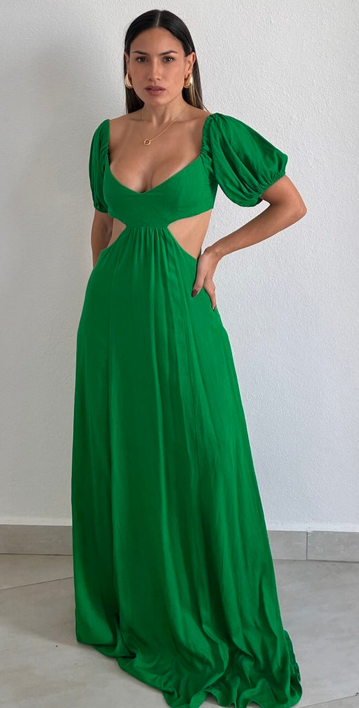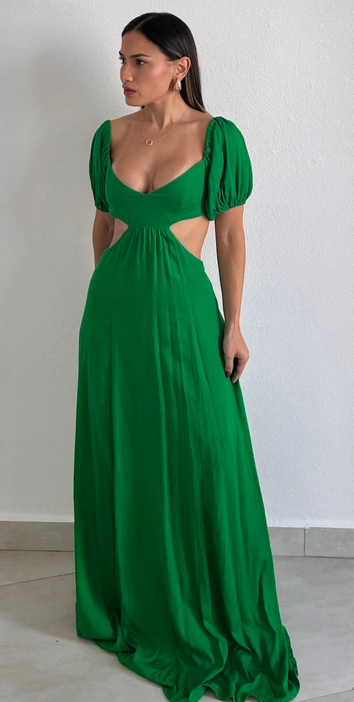 featuring Elastic Bubble Short Sleeves Top, Open at the Waist & Black, Adjustable at the Back and Maxi Skirt in a Linen Green Fabric.