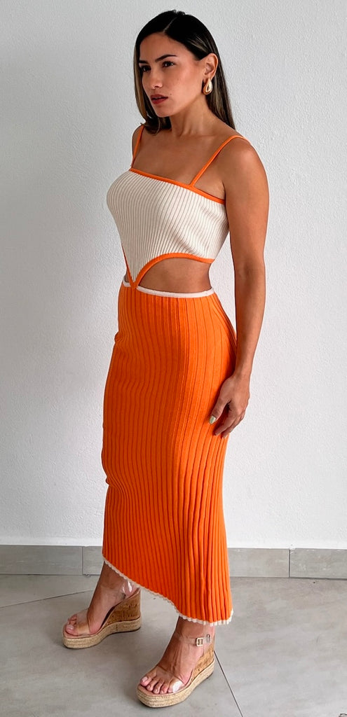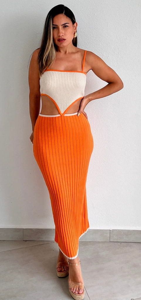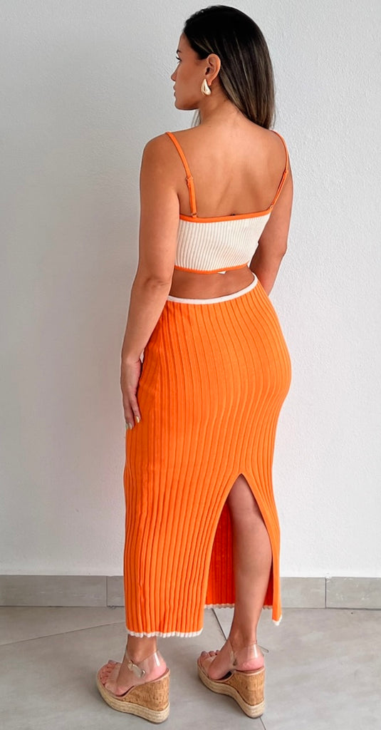 featuring Square Top with Adjustable Straps, Cut Out at the Waist and Midi Skirt in a Texture Knit Fabric.