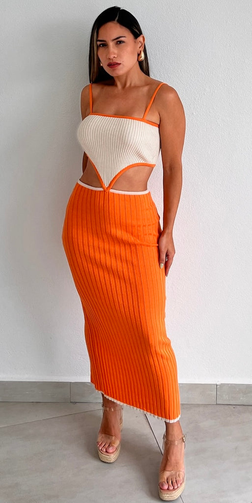 Lovely Orange Colorblock Bodycon Midi Dress