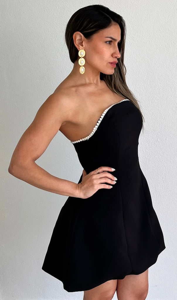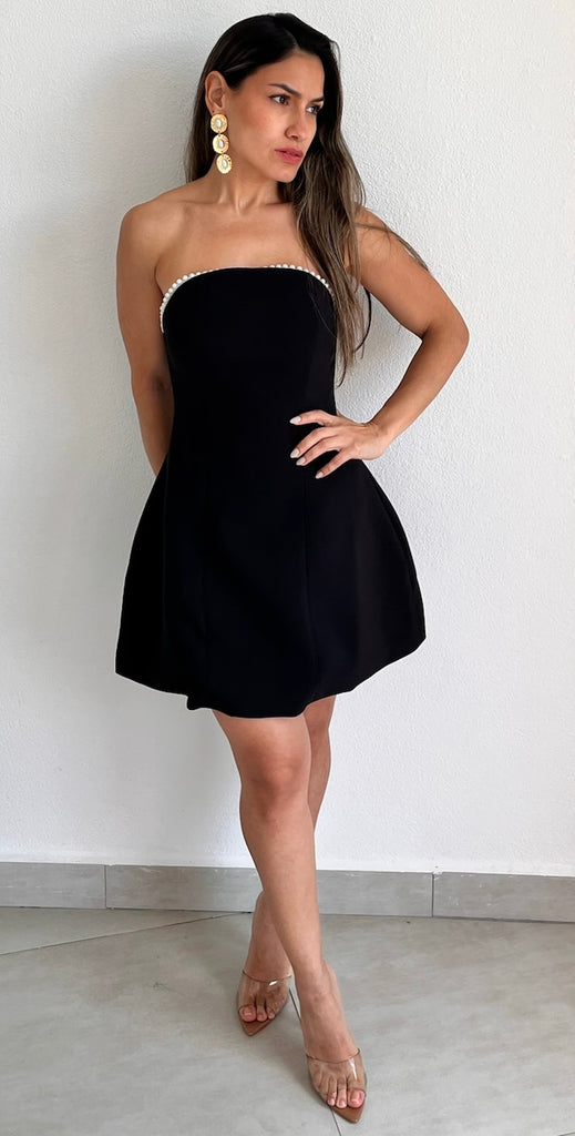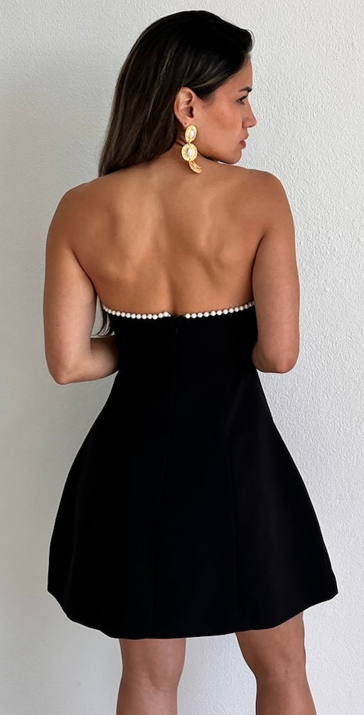 featuring Up-Strapless Top, Fitted at the Waist and Flare Skirt with White Pearls Detail at the Top.