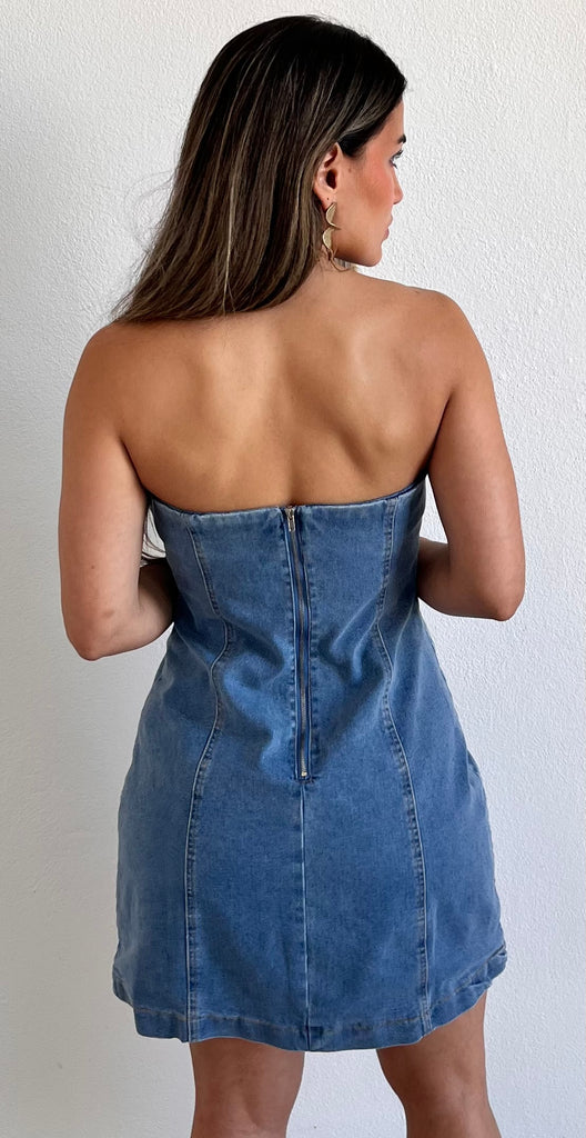 featuring Strapless V-Neck Asymmetrical Top, Fitted at the Waist and Hips, Midi Length in a Spandex Denim Fabric.