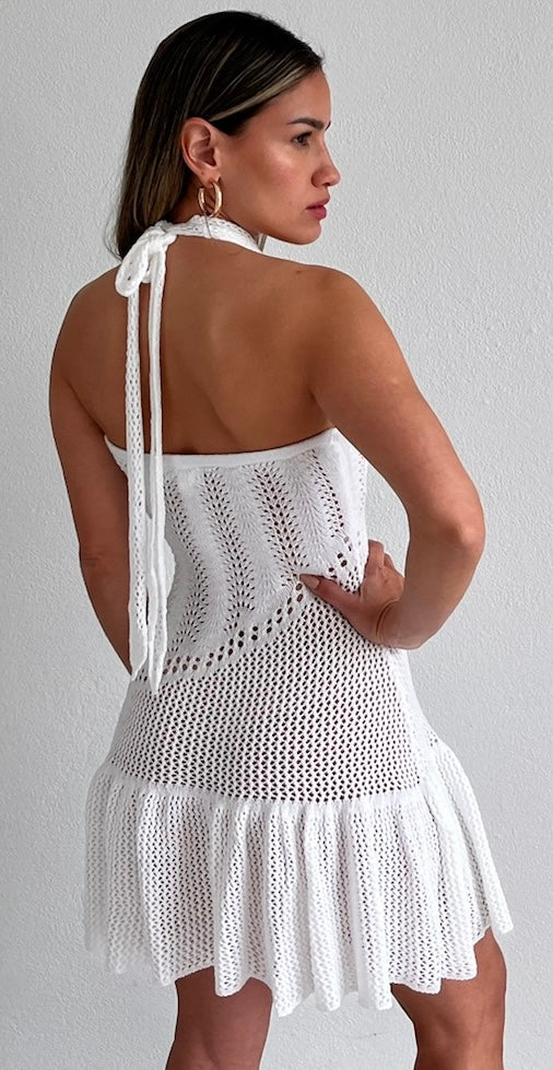 featuring Halter Top, Fitted at the Bust, Waist & Hips with Ruffled at the Bottom in a White Crochet Fabric.