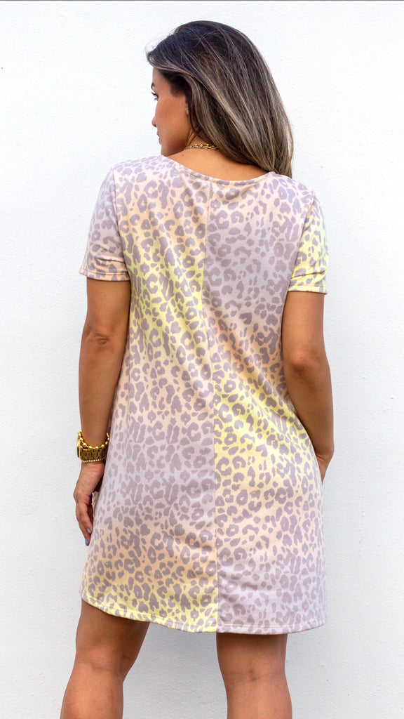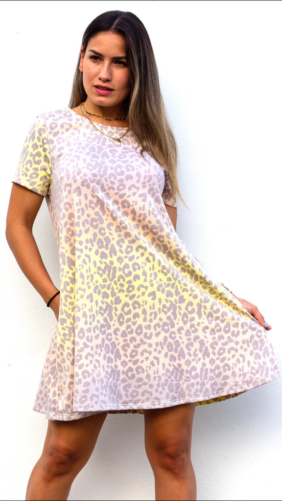featuring Short Sleeves Round Neck Comfy Dress with Pockets in a Knit Leopard Print Fabric.