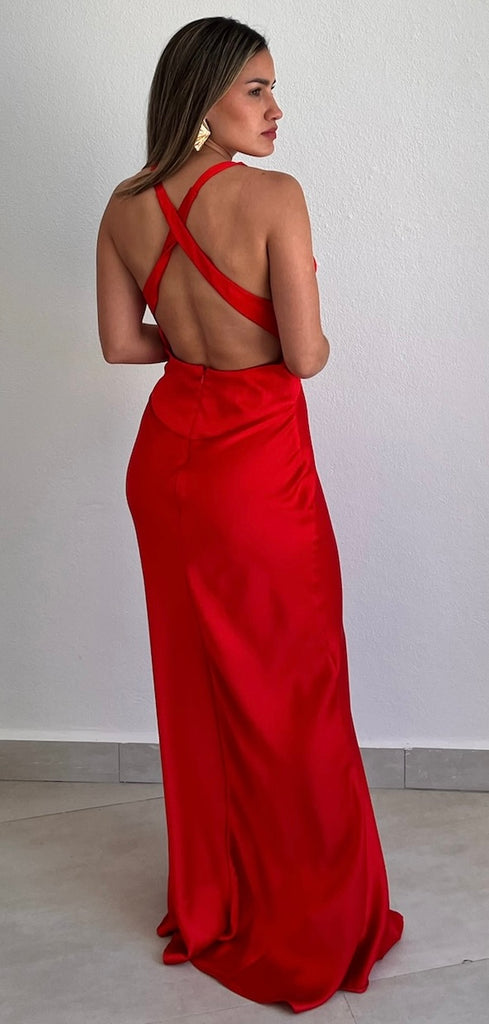 featuring Deep V-Neck Top & Crossed Back Top with Rose Fabric Details at the Waist and Loose but Fit Lo g Skirt in a Soft Satin Fabric.