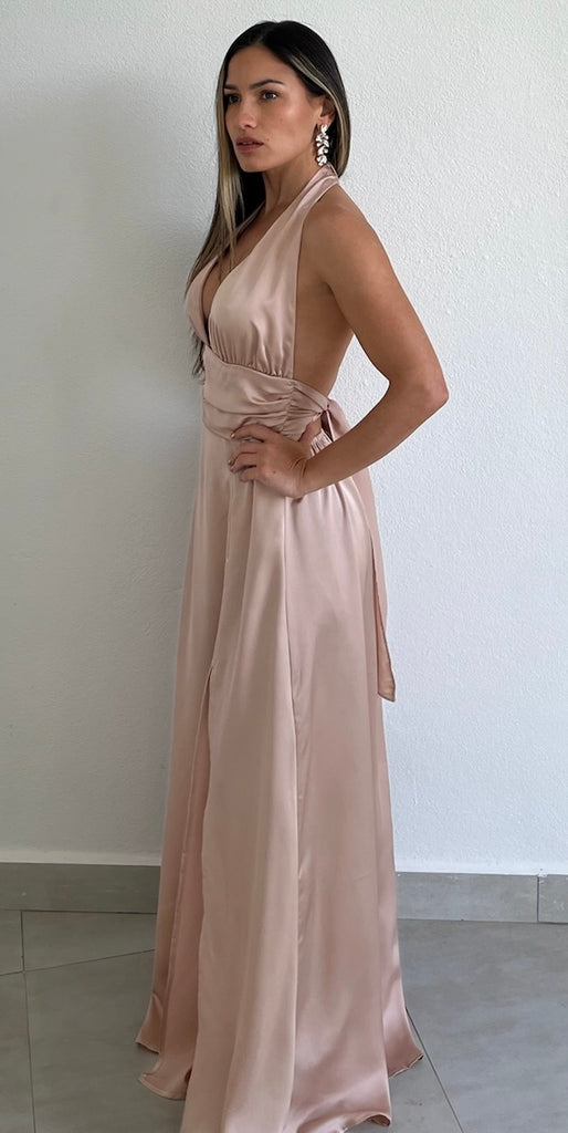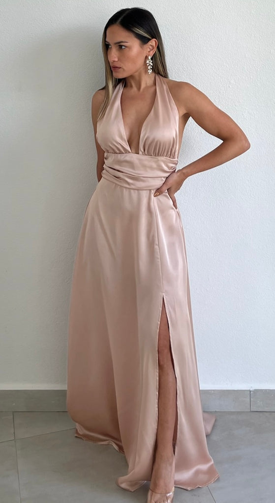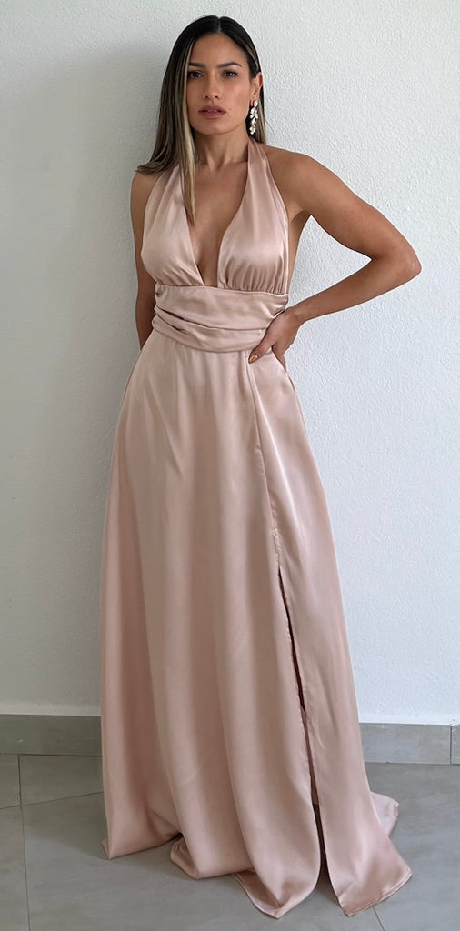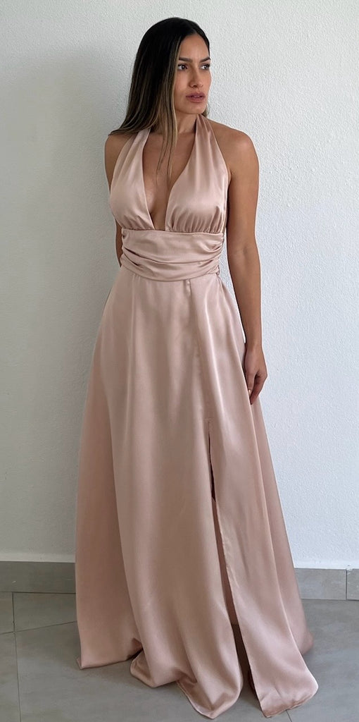featuring Halter Top, Adjustable at the Waist and Flare Skirt with Slit Detail in a Satin Fabric.