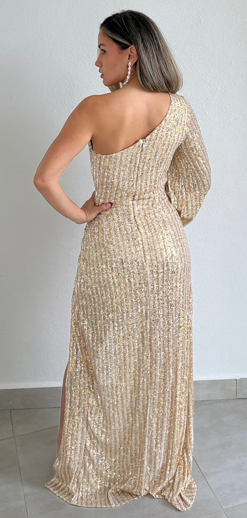 featuring One-Shoulder Long Sleeve Top with Twisted Detail at the Waist and Open Slit Detail in a Gold & Silver Stripes Sequins Fabric.