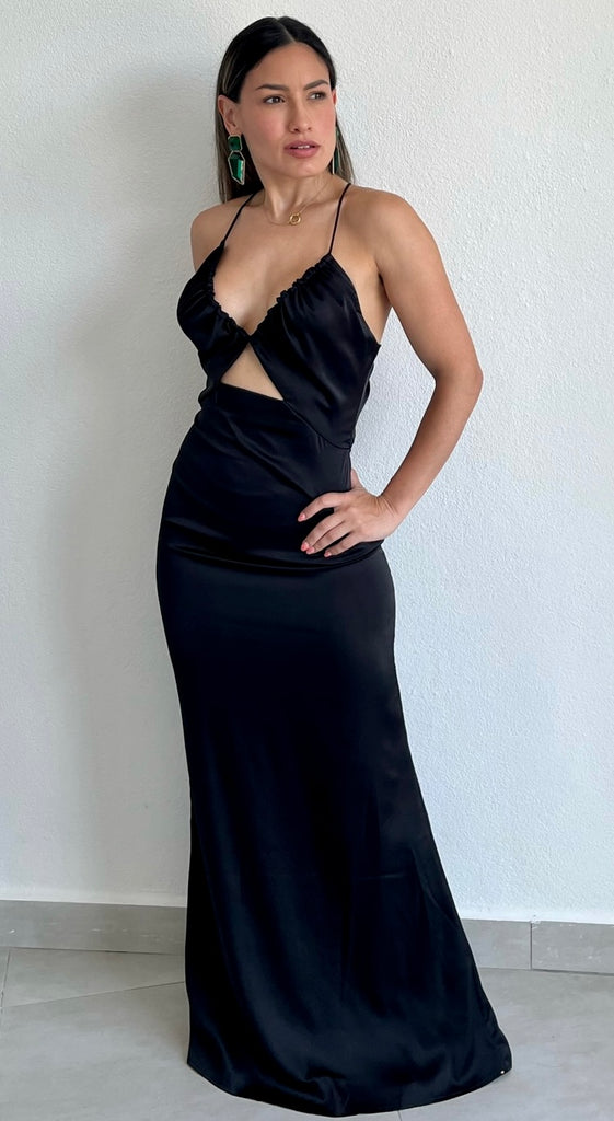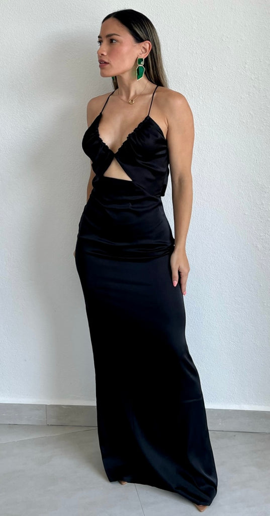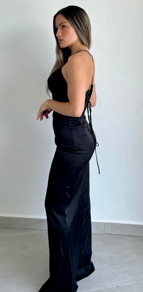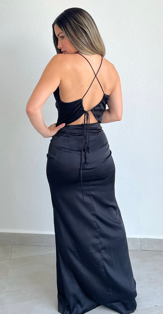 featuring V-Neck Top with Spaghetti Straps, Crossed Back and Fitted Skirt in a Soft Black Satin Fabric.
