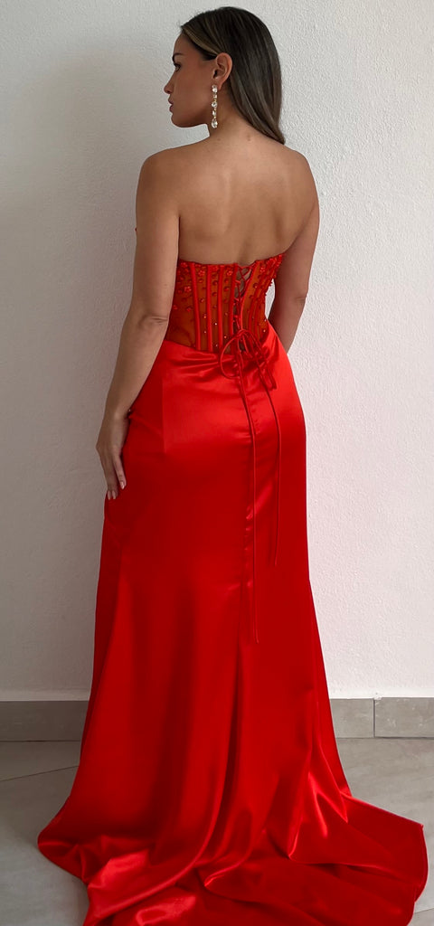 featuring Strapless V-Neck Corset Top with Beads Details, Fitted and See Through at the Waist and Satin Open Slit Skirt.