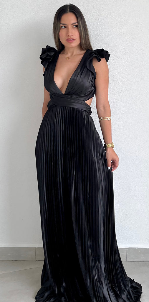 featuring V-Neck Top with Ruffle Skort Sleeves and Crossed at Back with Flare Plated Skirt in a Satin Black Fabric.