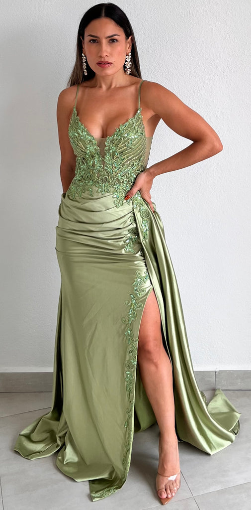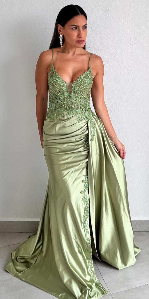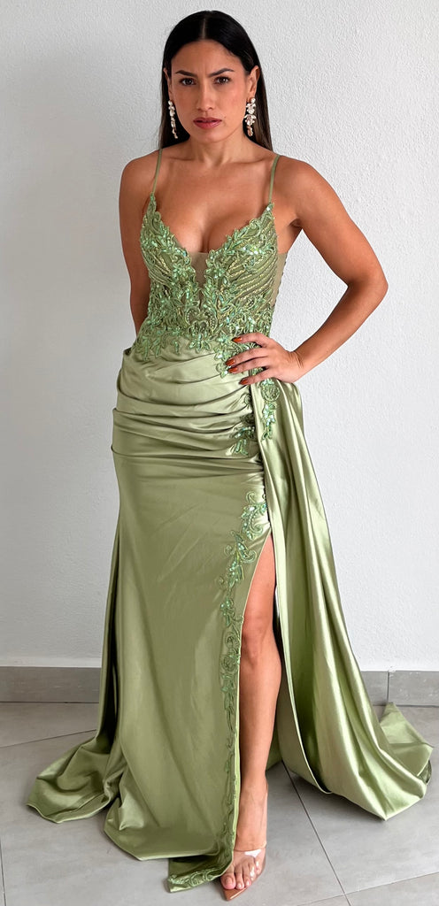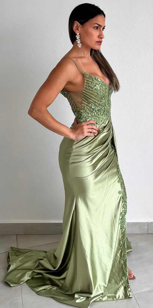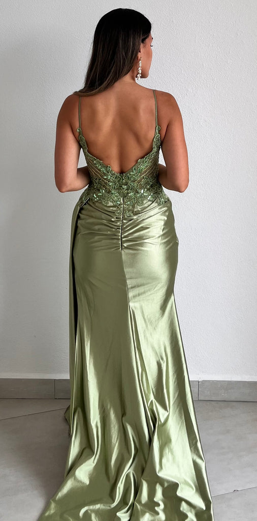 featuring V-Neck Top & Back, Fitted at the Waist and Hips. Scrunched at the Back Open Slit in a Soft Satin Fabric.